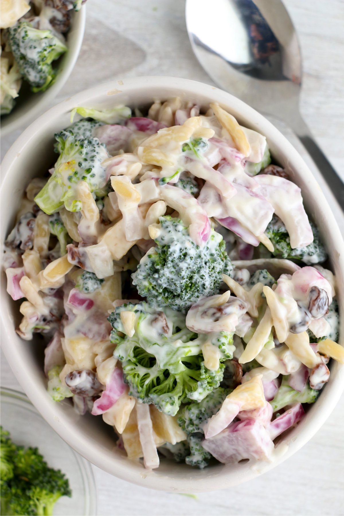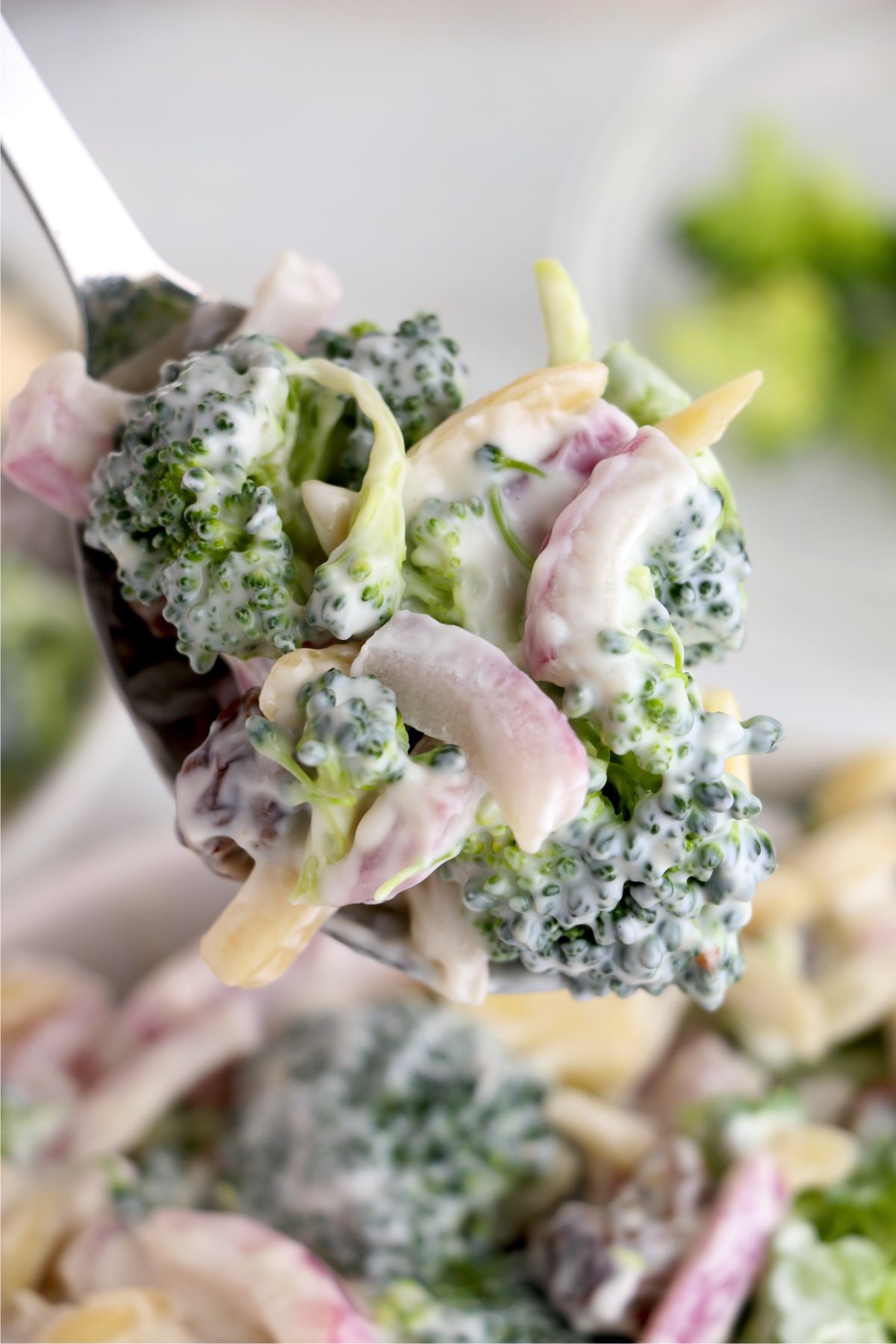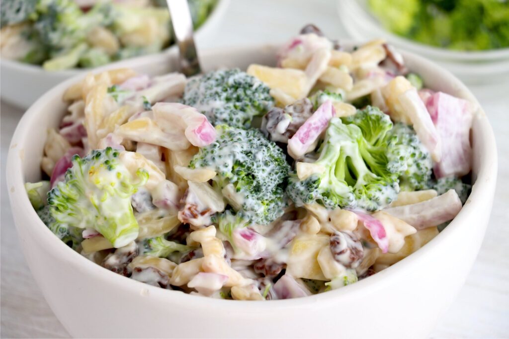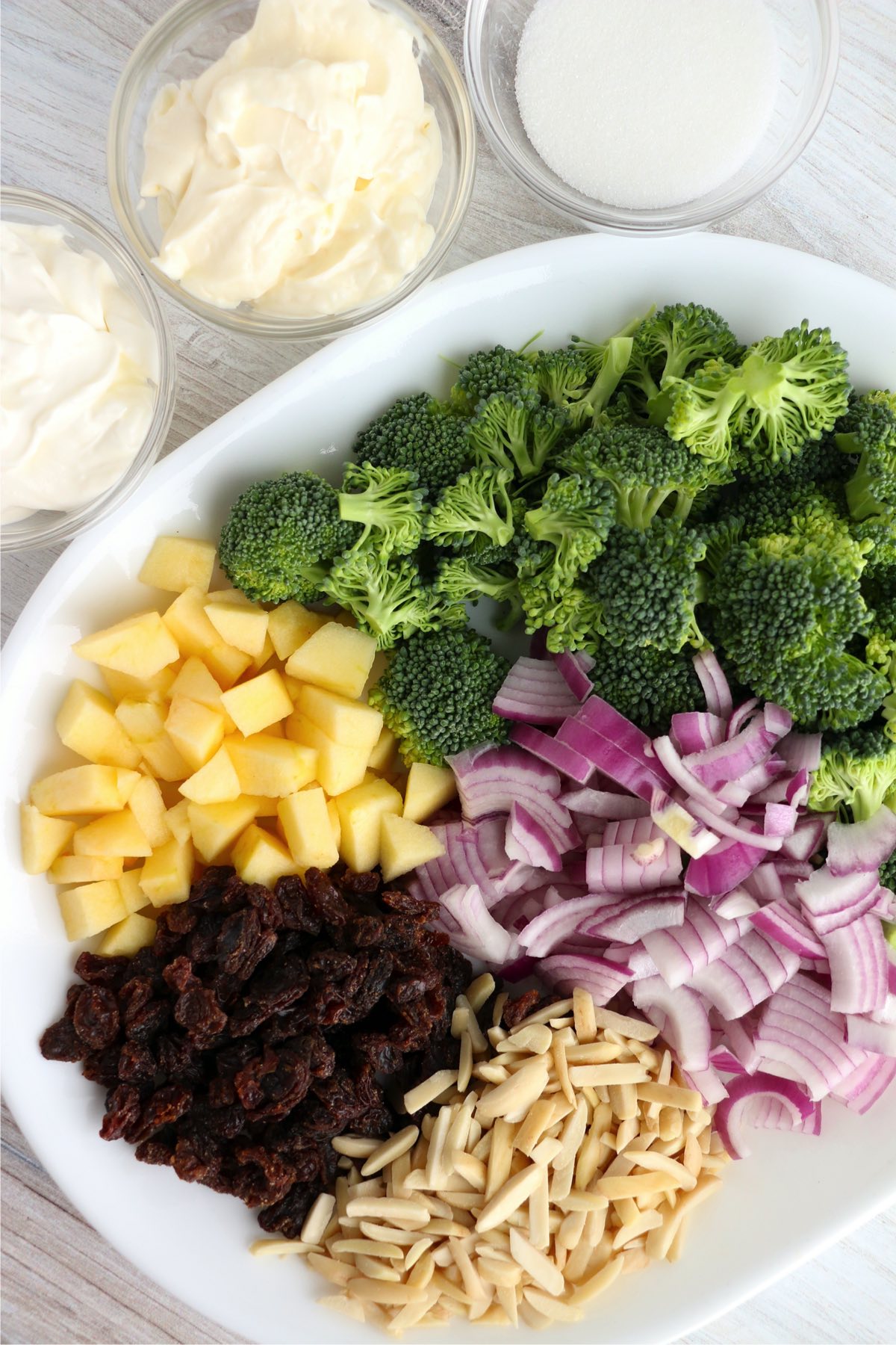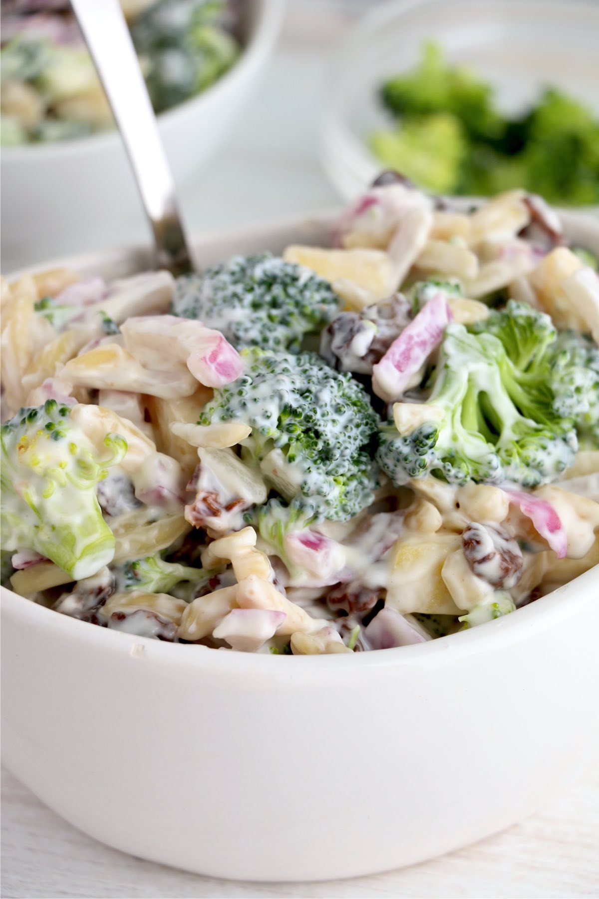 Crisp broccoli, sweet raisins and apples, the bite of red onions, crunchy almonds, and a tangy, sweet sour cream and mayo dressing come together to create a side that explodes with flavor in every bite.