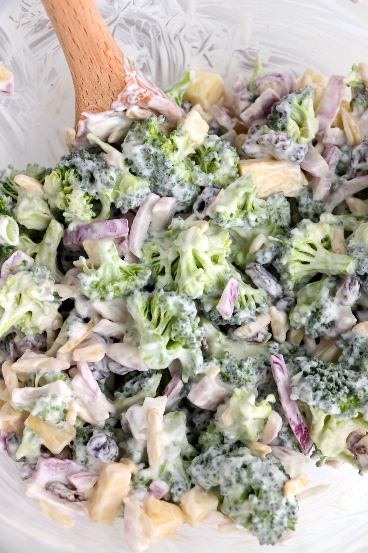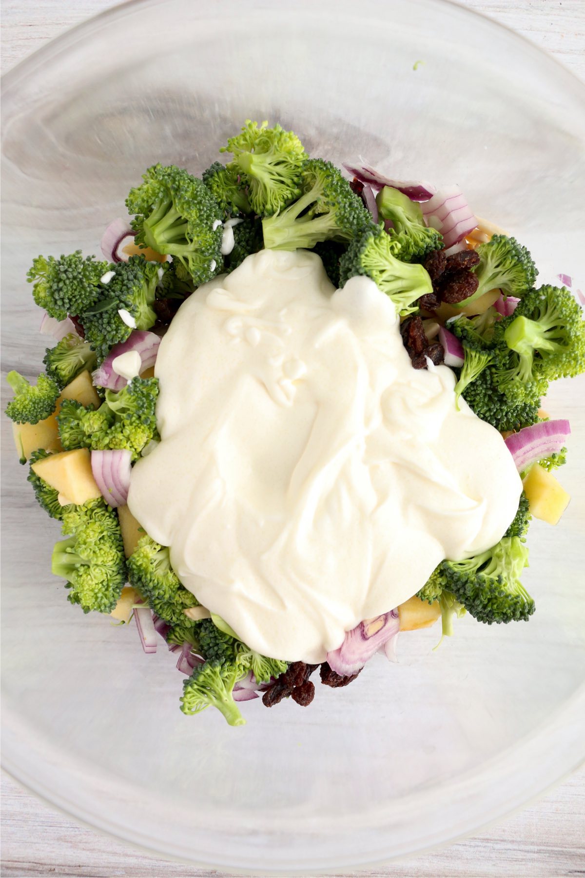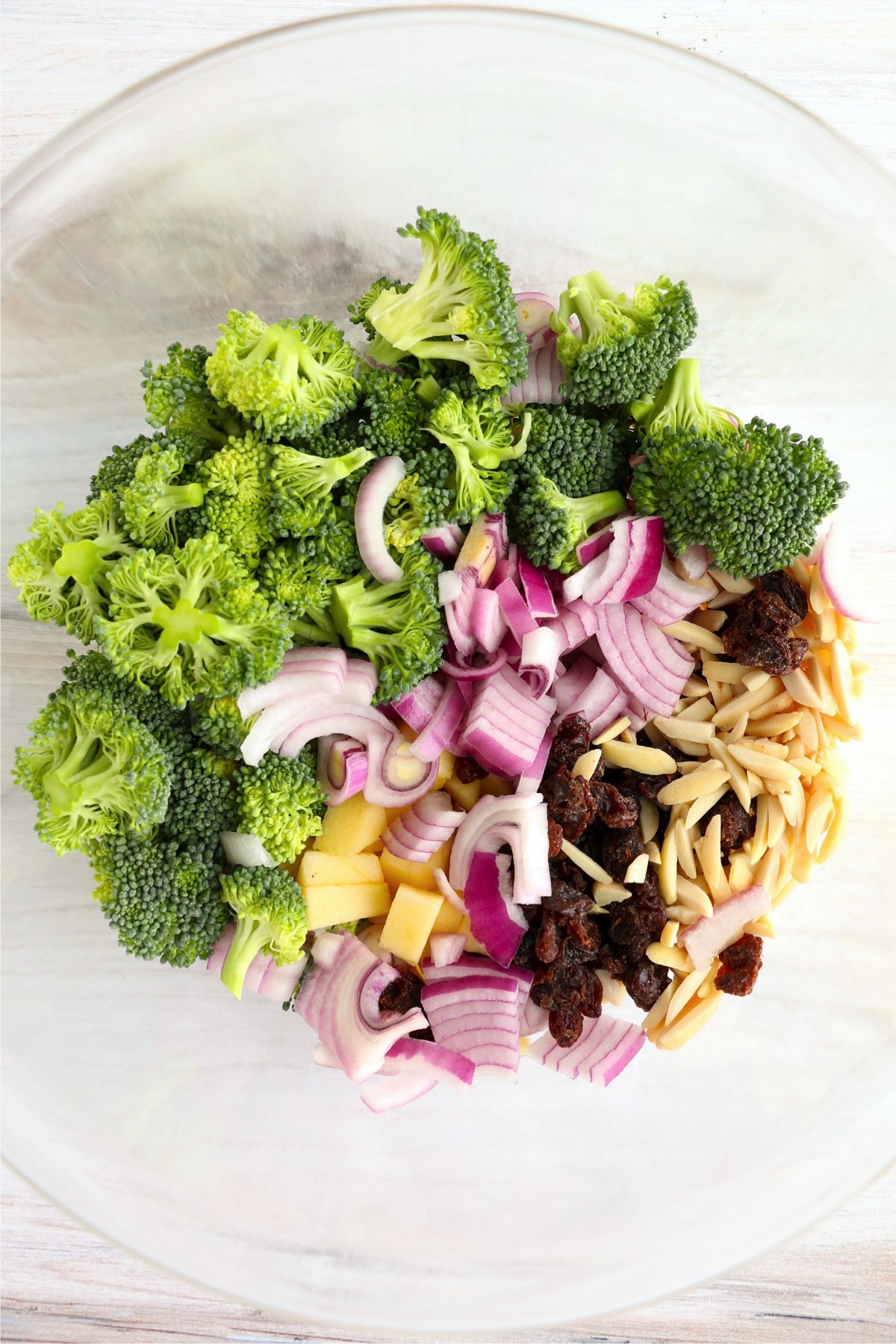 - Place broccoli, raisins, onion, apple, and almonds in a large mixing bowl.