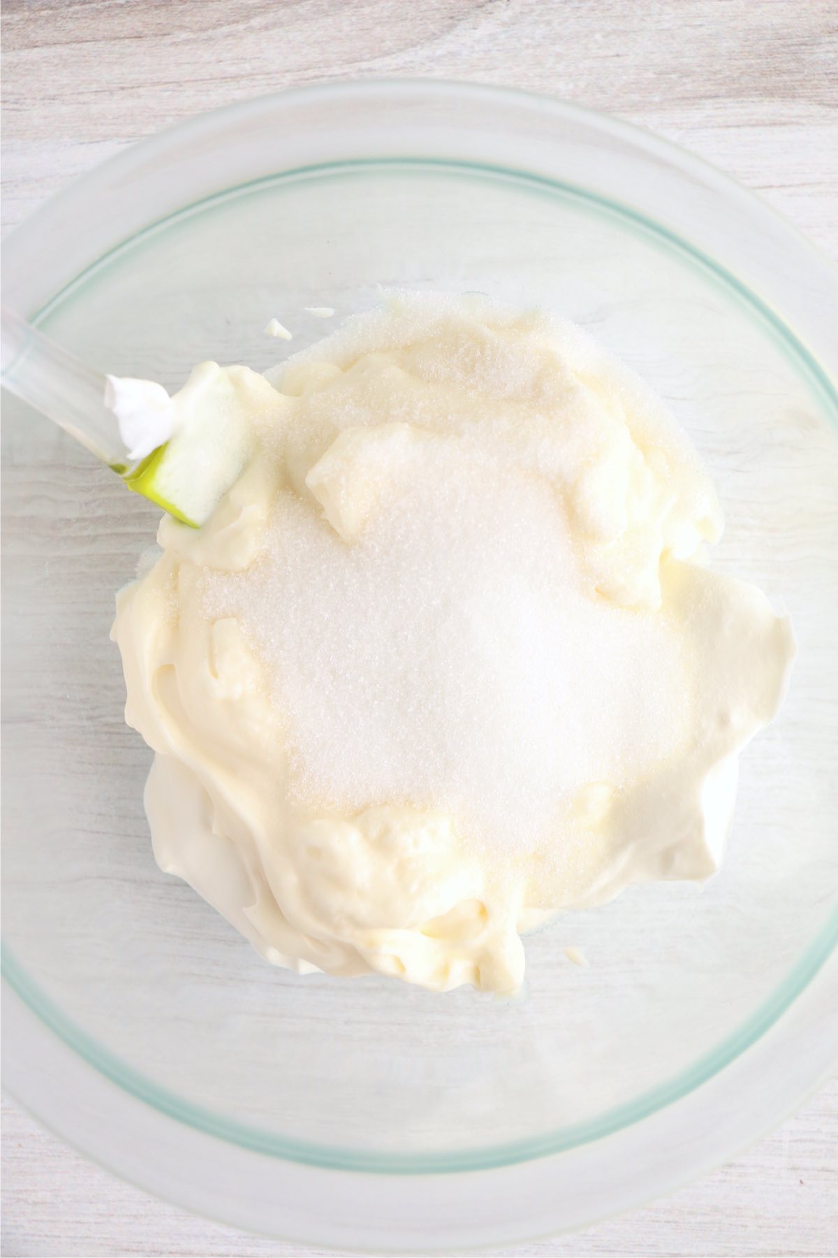 Step 2: Prepare the dressing by whisking mayonnaise, sour cream, and sugar together.