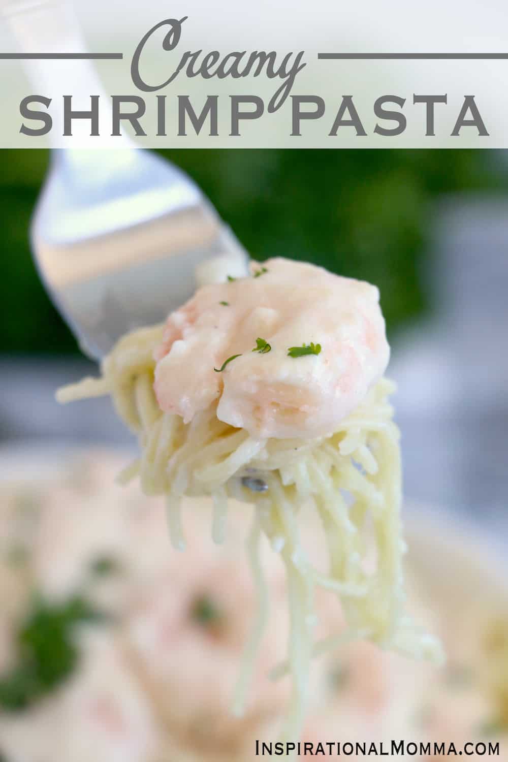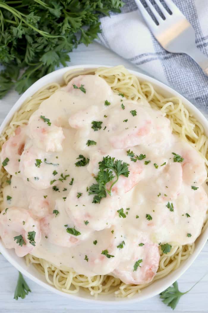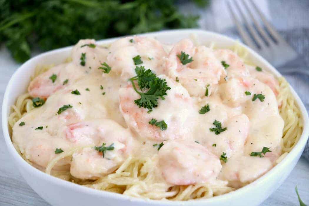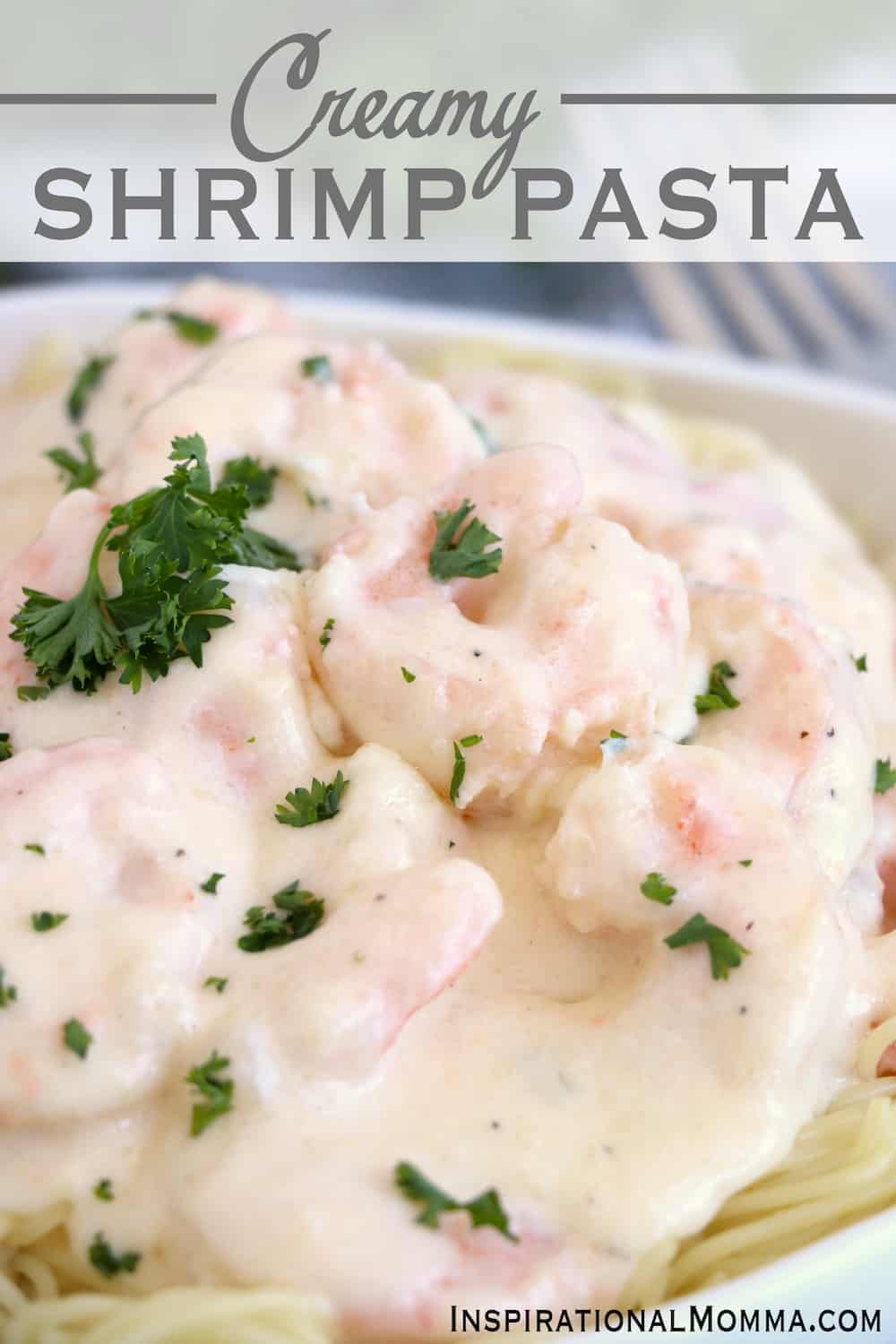 This Creamy Shrimp Pasta recipe is perfect for an easy weeknight dinner. Tender shrimp and angel hair pasta smothered in homemade Alfredo sauce.
