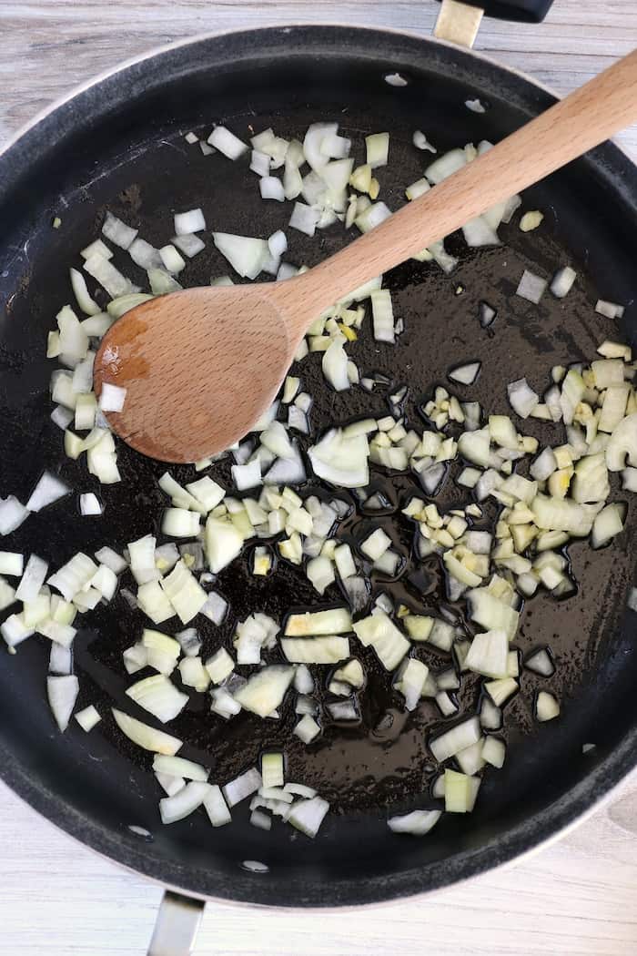 To get things started, put the olive oil, diced onions, and minced garlic in a large sauce pan. Cook it over medium heat until the onions are transparent.