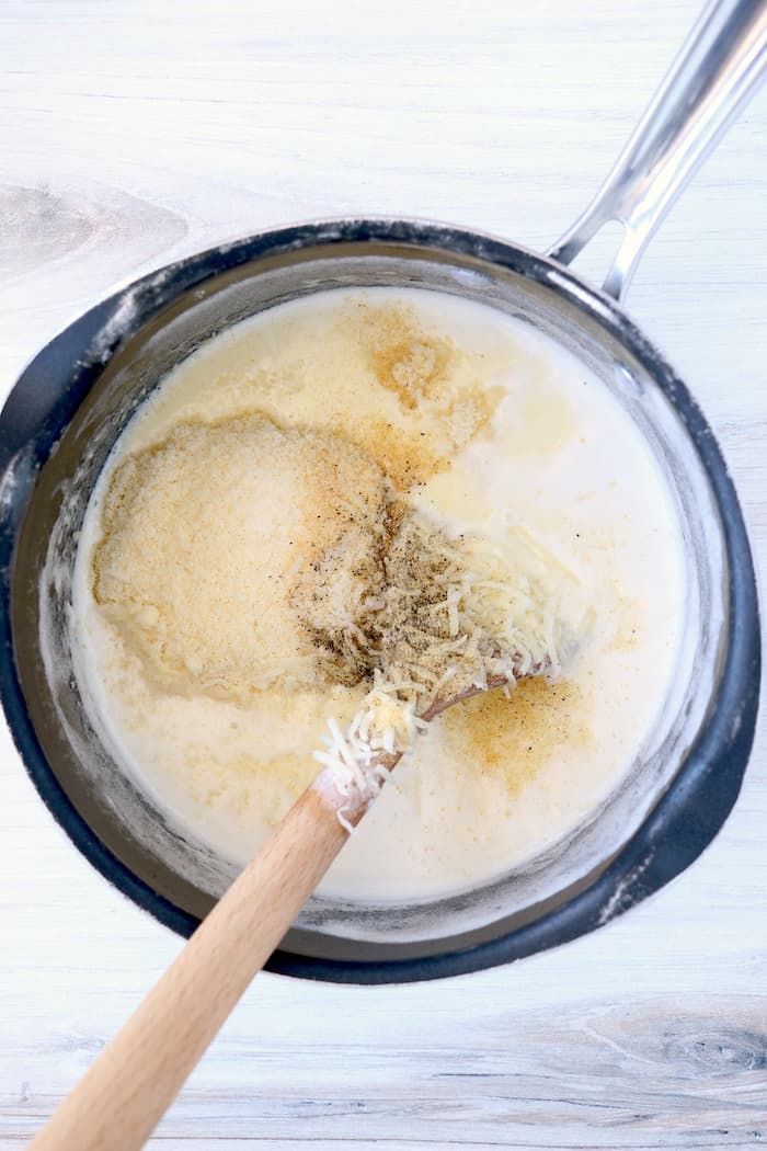 Next, we are going to stir in the parmesan cheese, mozzarella cheese, garlic powder, salt, and pepper until cheese is melted. Continue stirring and reduce the heat. The sauce will thicken.
