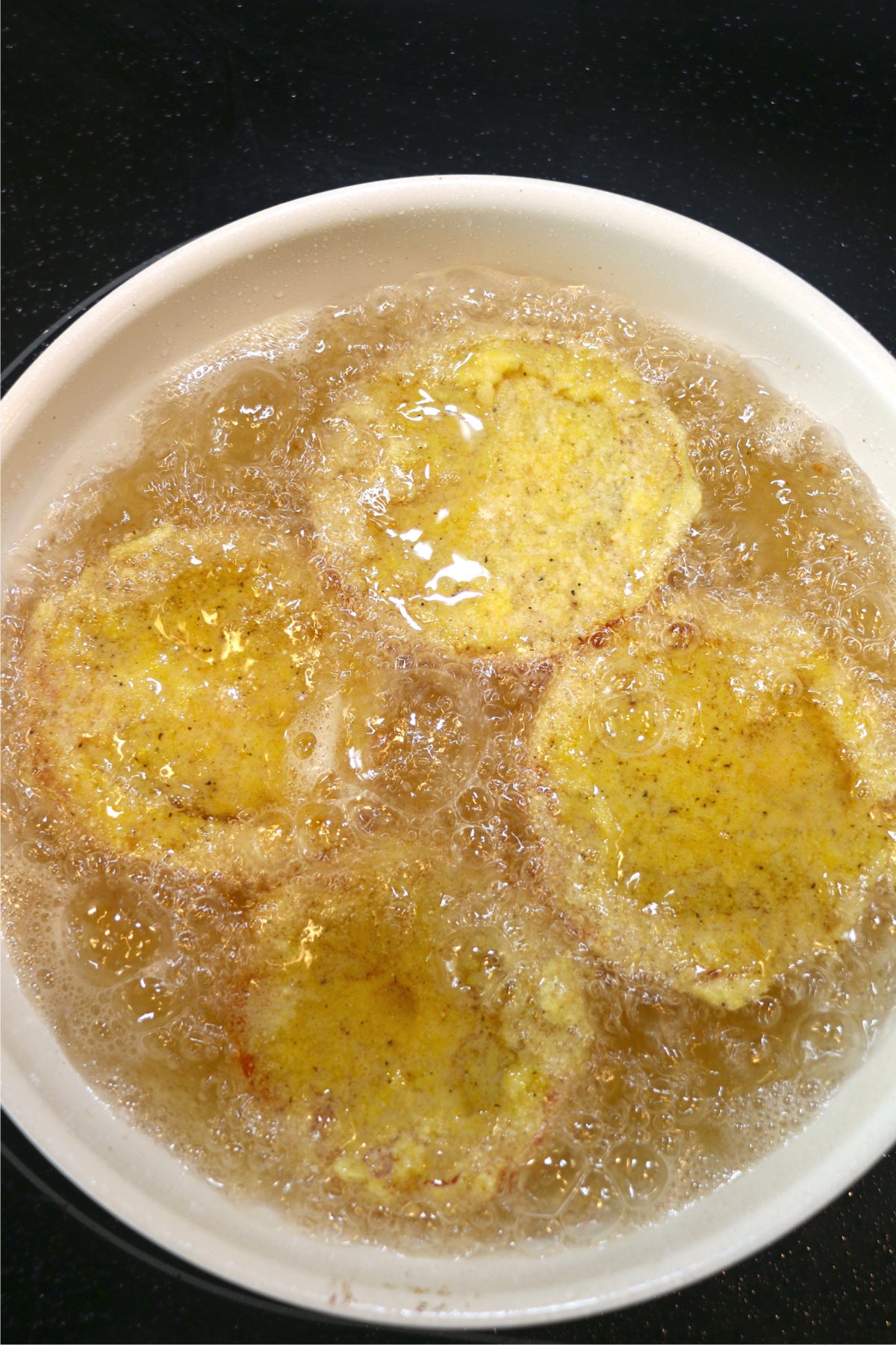 Step 2: Add battered tomato slices to your skillet in batches and fry until a golden brown color. This will take 2 to 4 minutes per side.