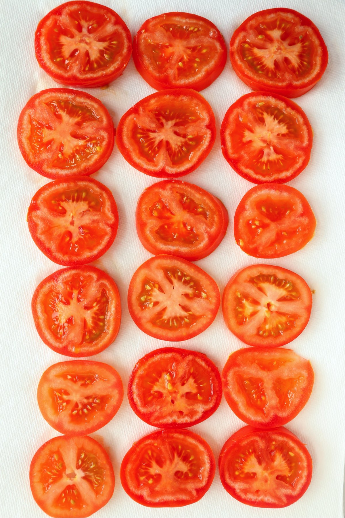 - Lay sliced tomatoes on the paper towel, allowing them to drain.