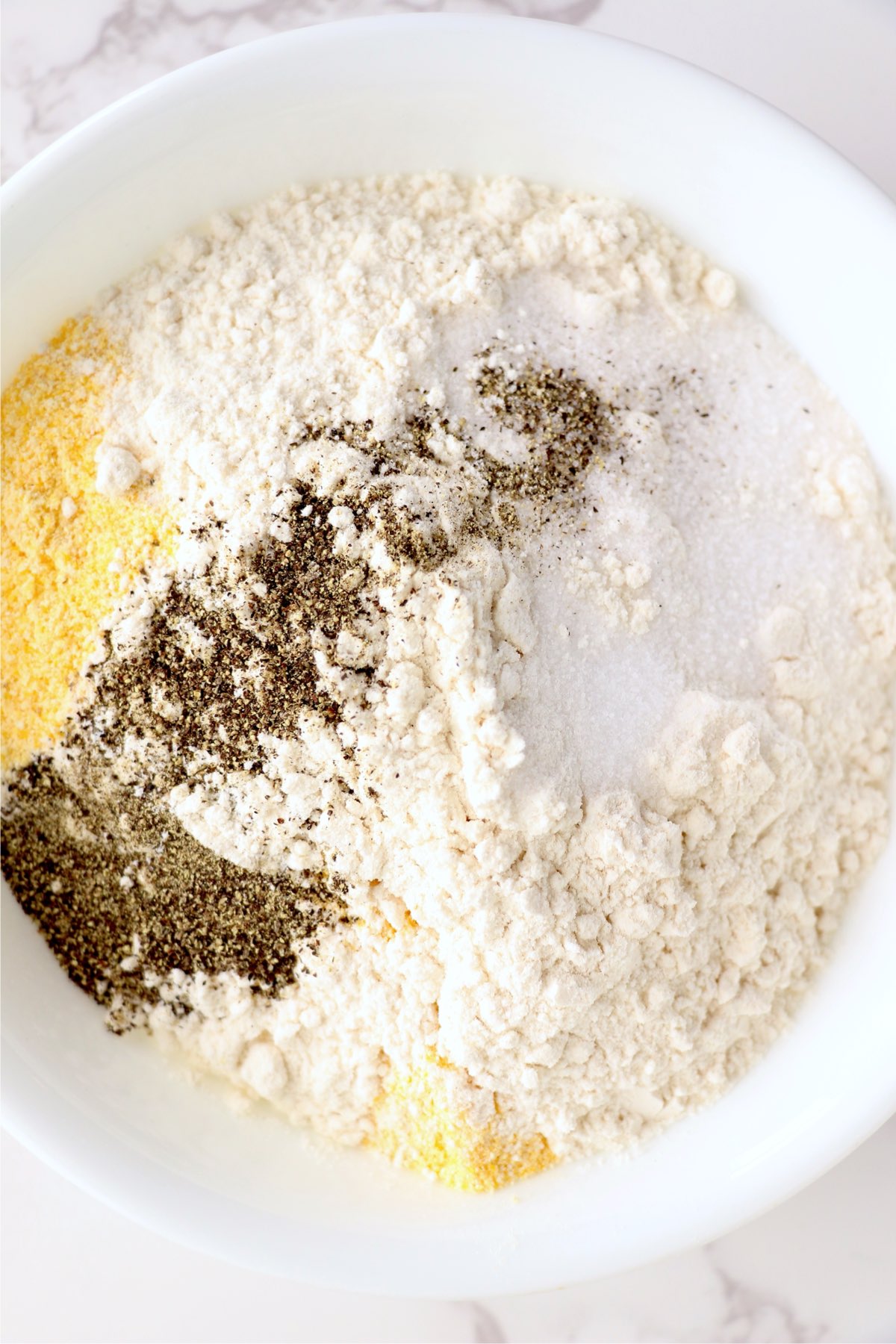 Step 8: In another mixing bowl, combine cornmeal, flour, Parmesan cheese, salt, and pepper.