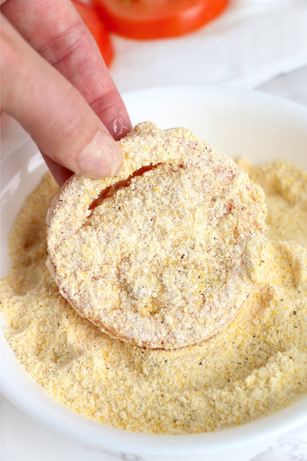Step 9: Dredge each tomato slice in the buttermilk mixture then coat it in the dry ingredient mixture.