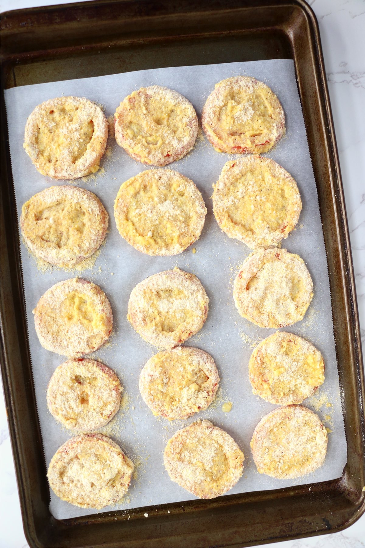 - Place battered tomatoes on your prepared baking sheet until all are done.