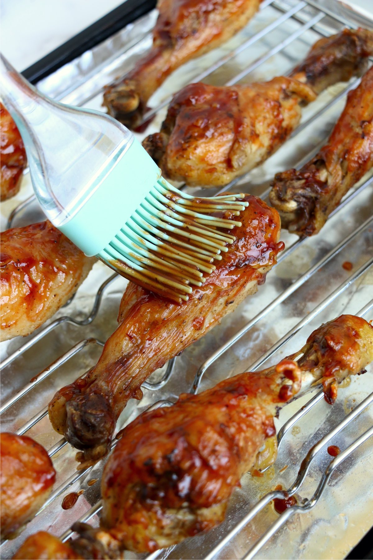 Step 8: Remove chicken from the oven and brush BBQ sauce over them.