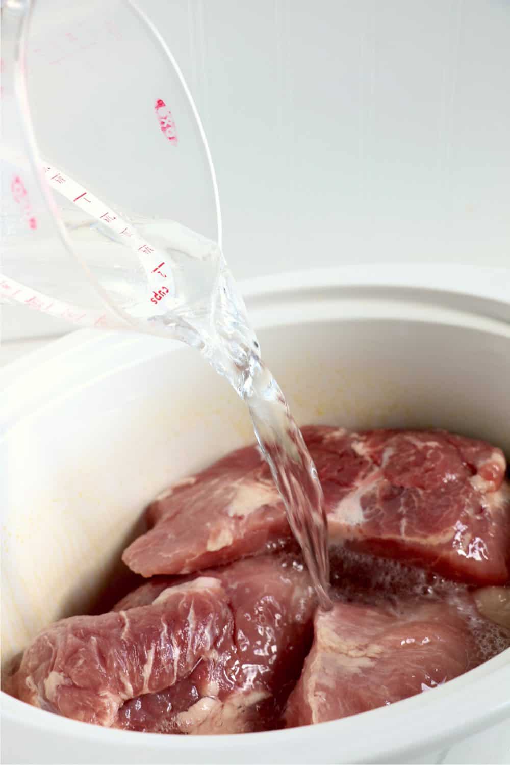 If you don't add in enough water, your pork roast will become dry. No one likes dried-up shredded pork...no one. It doesn't have to be fully covered by water but there should be quite a bit of water so that it can cook and pull in the moisture.