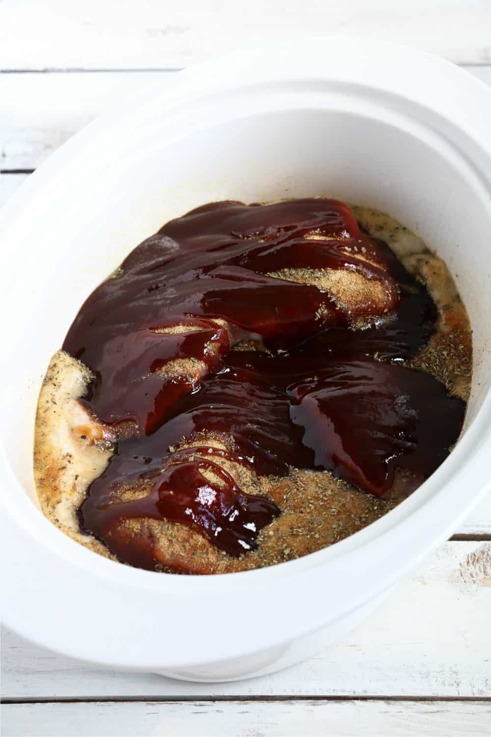 - Cook on LOW for 8 hours or until tender. Using two forks, shred the pork and stir well. Add more BBQ sauce if desired.