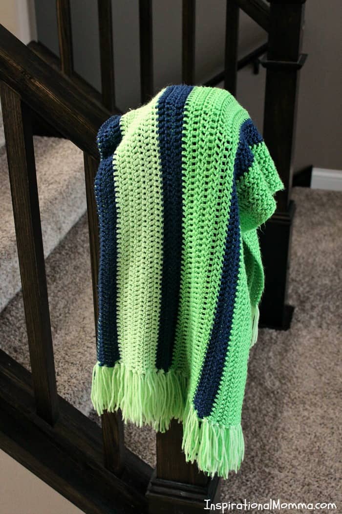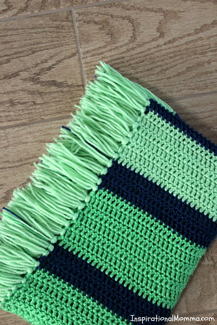 Over the years, I cannot even begin to count the number of blankets she has made for my children. So many different colors, so many different stitches and patterns. And it never gets old. Our oldest daughter is now 10, and she still gets excited when Grandma Pam gives her something she made. This particular Double Crochet Striped Blanket was one of those random gifts that my mother-in-law created and gave to my children. While she does like to tackle challenging patterns at times, this blanket is a perfect project for all crocheters, even beginners. I called it the Double Crochet Striped Blanket because that is exactly what it is. You can create this gorgeous blanket with just one stitch, the double crochet. Then, to add a little flair, she added some cute fringes to top it off. I have included a quick tutorial if you aren't quite sure how to add those fringes.