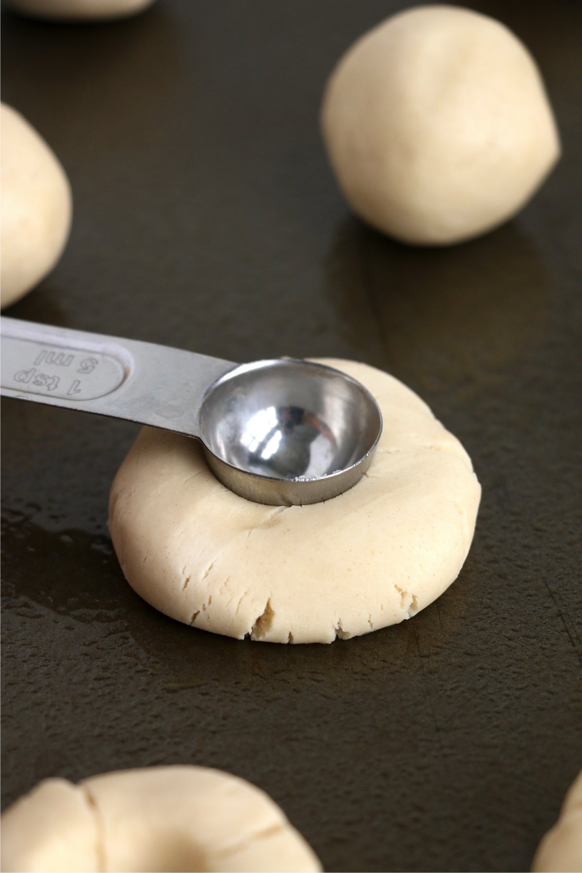 - Using a teaspoon measuring spoon, create a small divot in the center of each cookie.