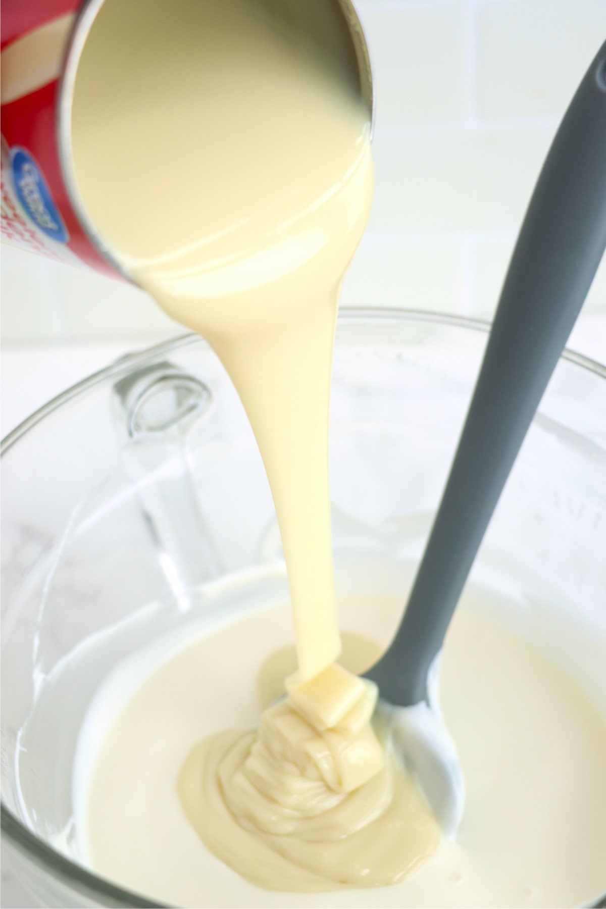 2: Add the sweetened condensed milk, and let the mixture cool a bit.