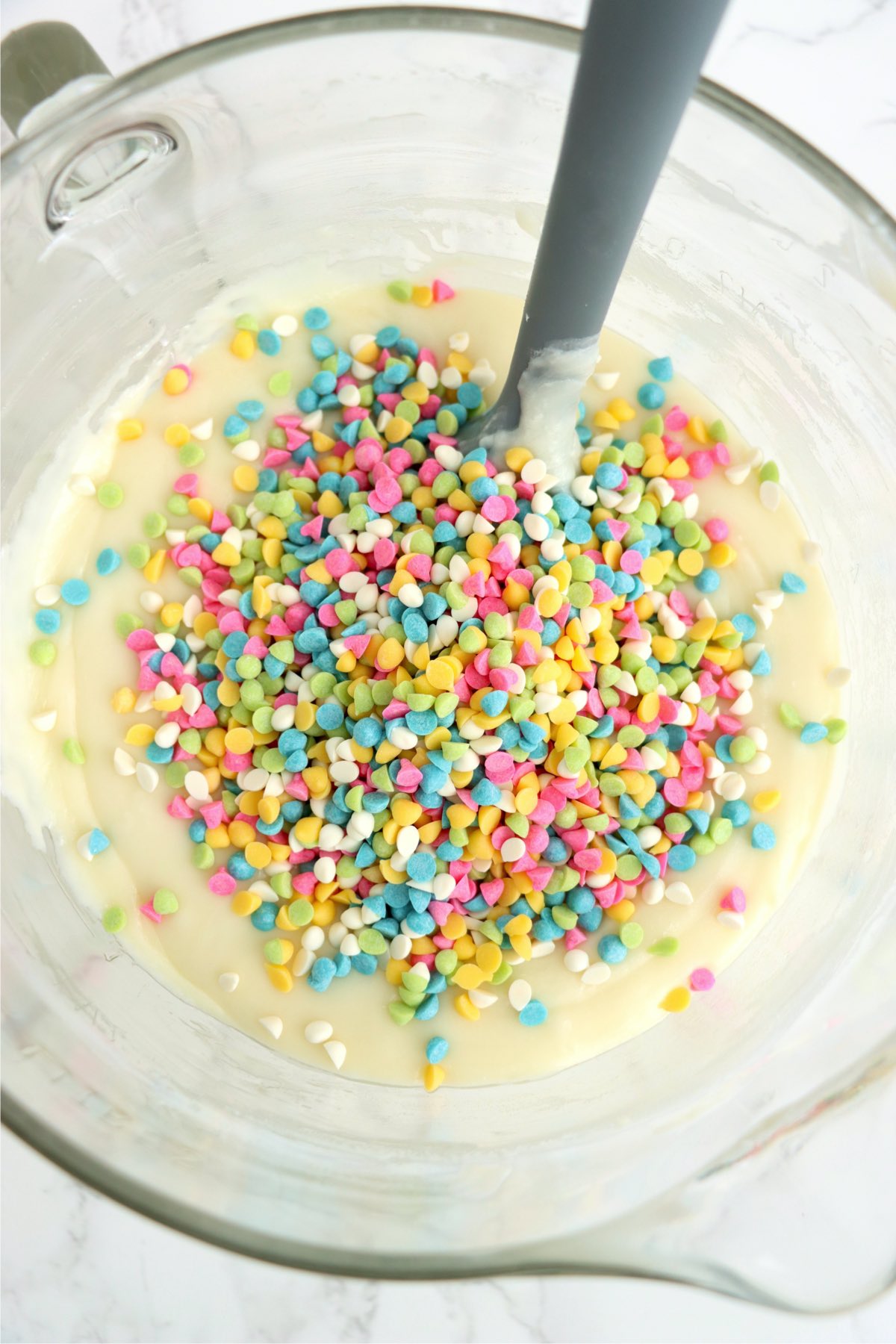 3: Mix in the colored chips and pour the mixture into a prepared pan.