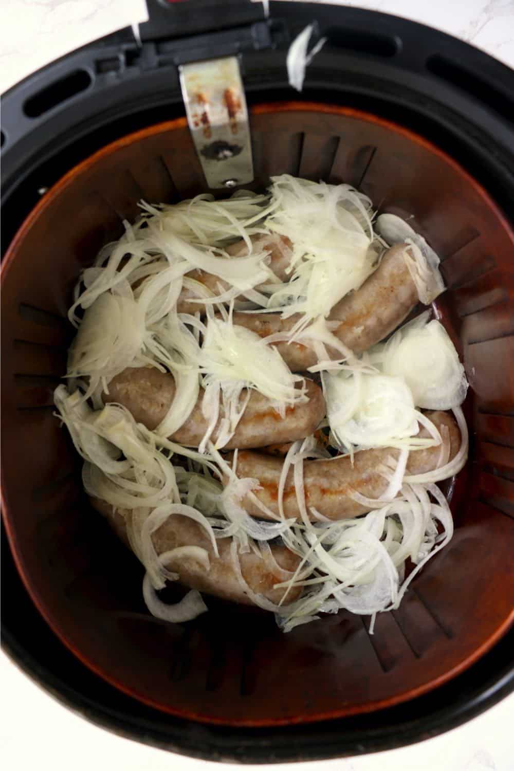 Air fry for an additional 7-8 minutes, stirring the onions a few times. Be sure the internal temperature of the brats reaches 160ºF.