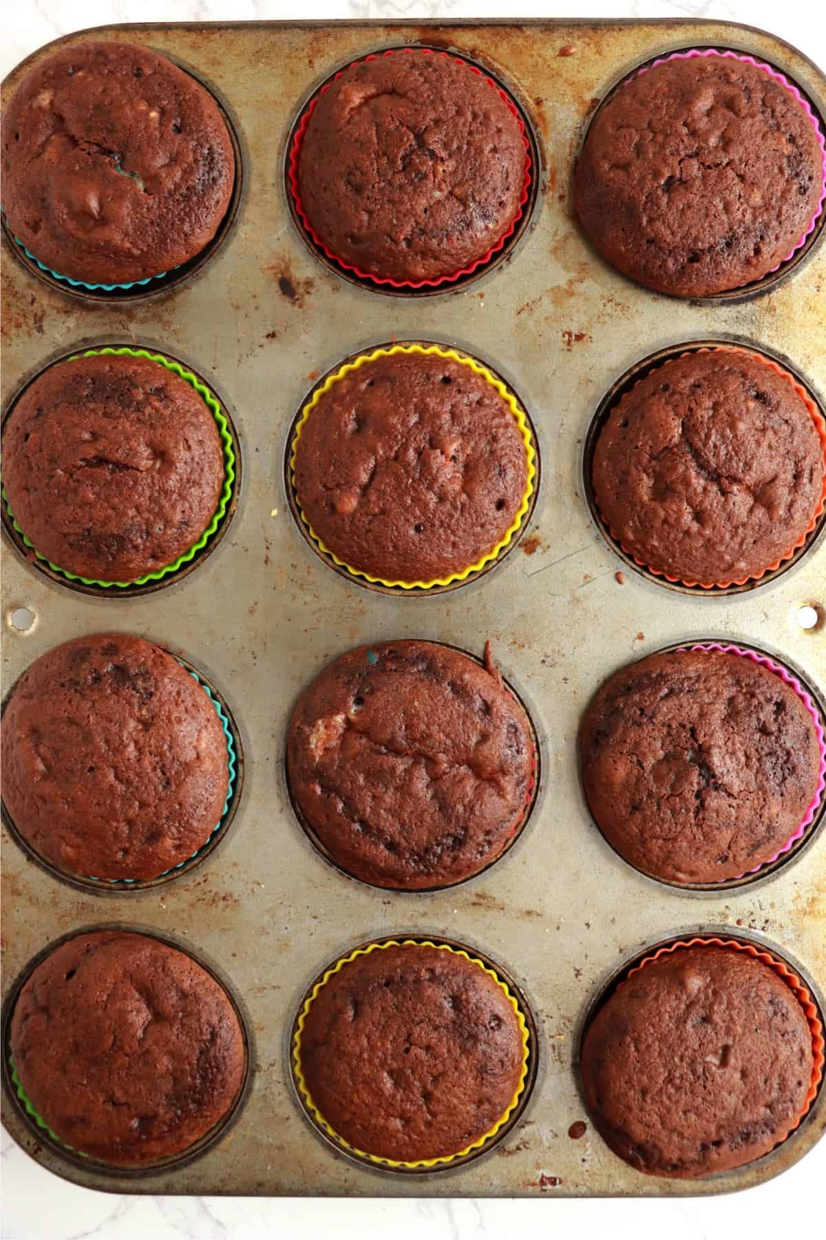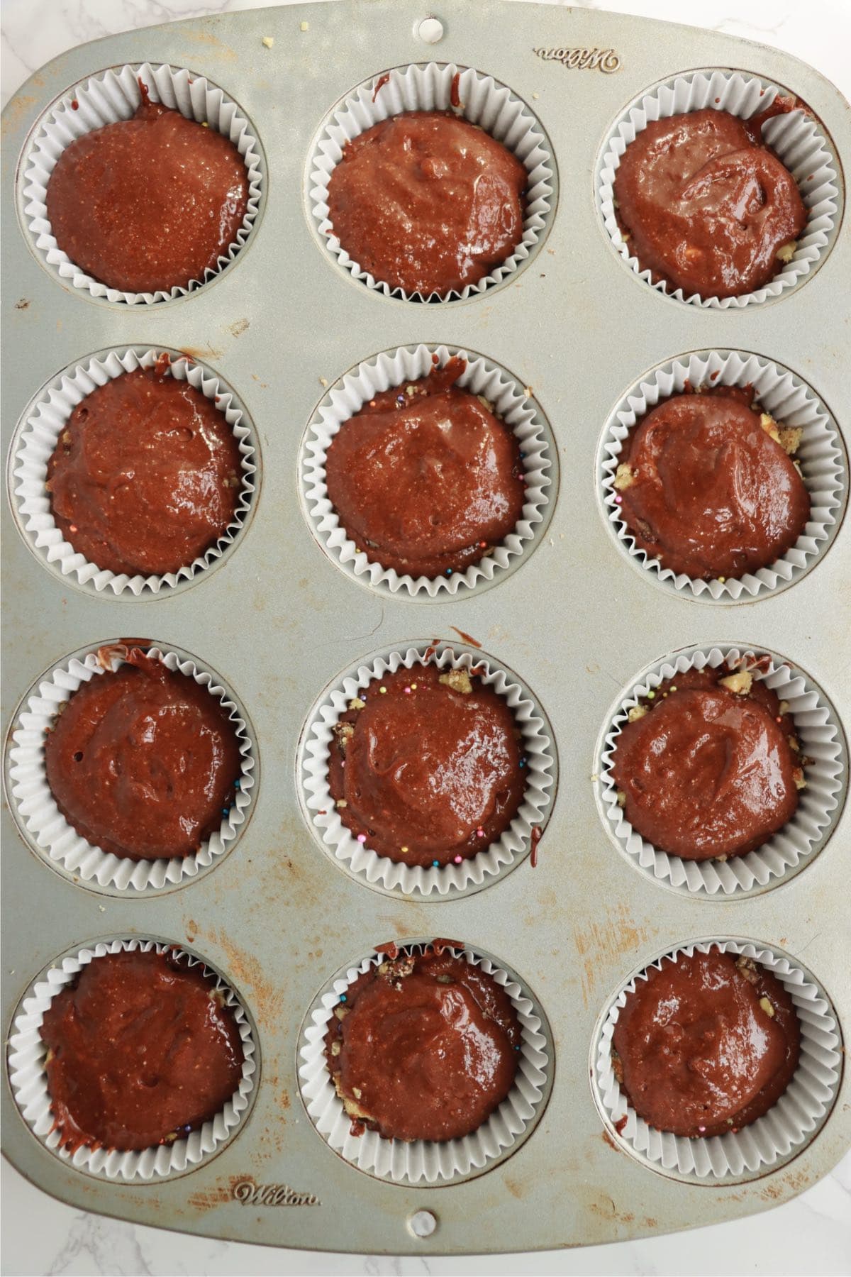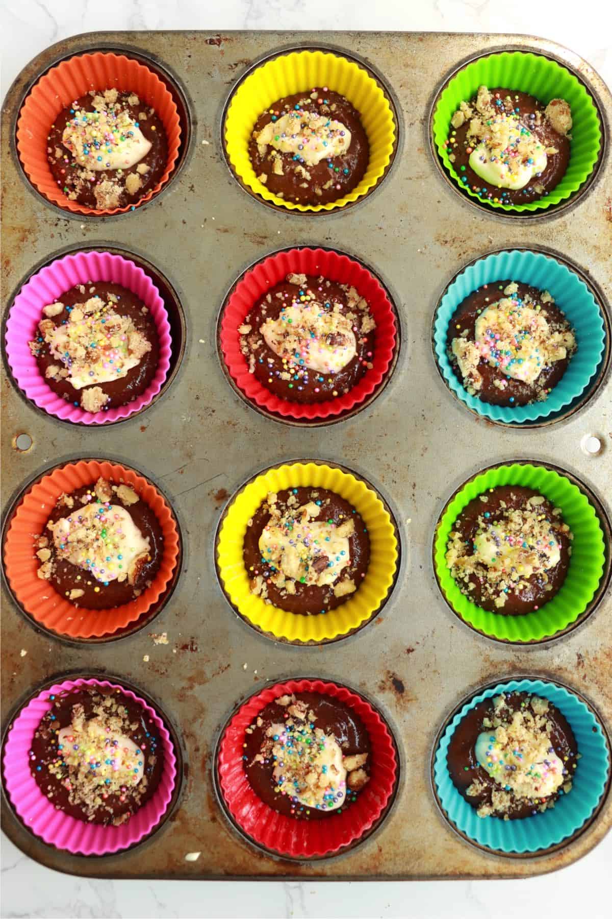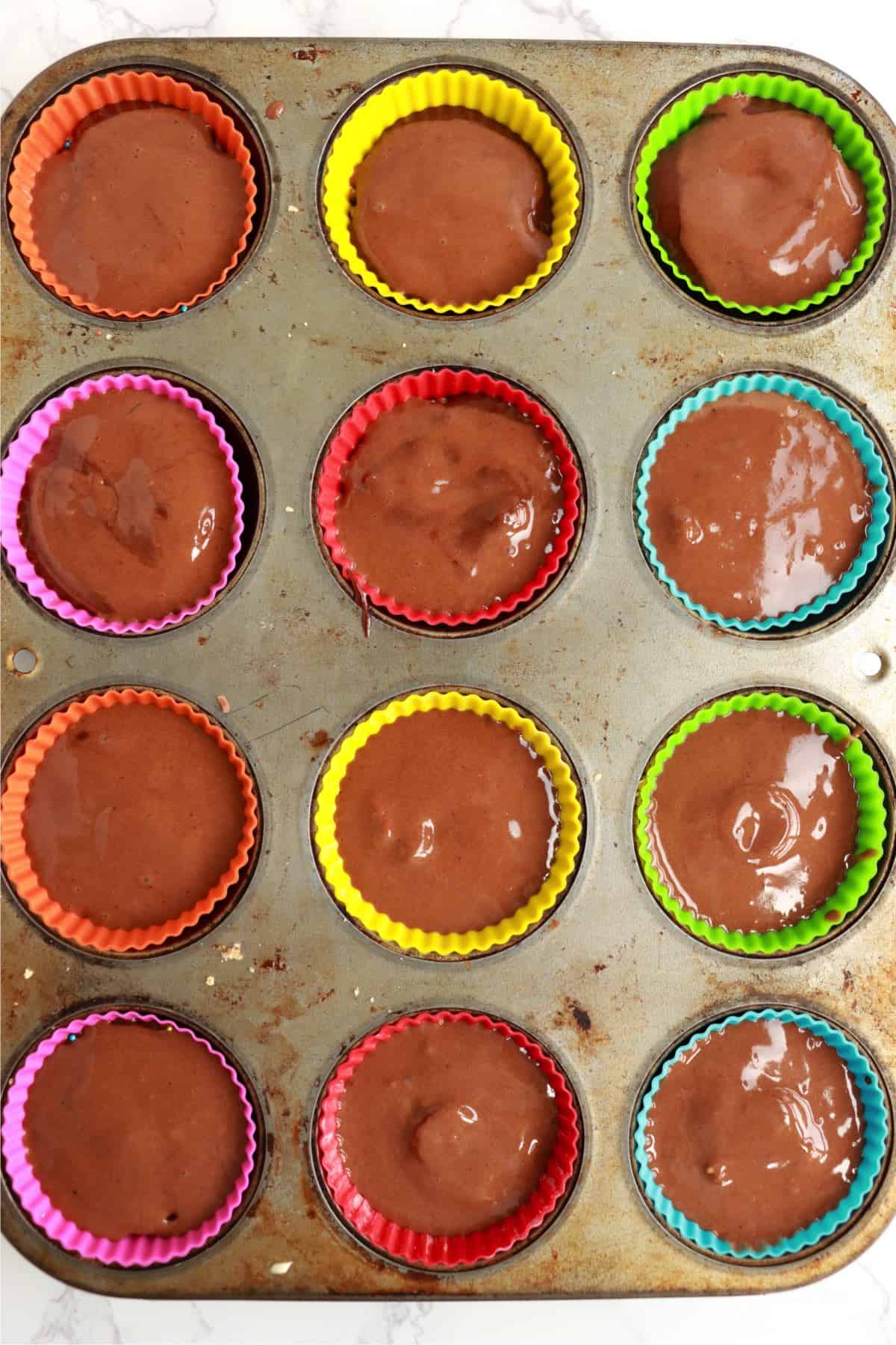3: Fill cupcake liners halfway with chocolate cake mix. Then, add the filling ingredients and finish filling the liners with chocolate cake mix.