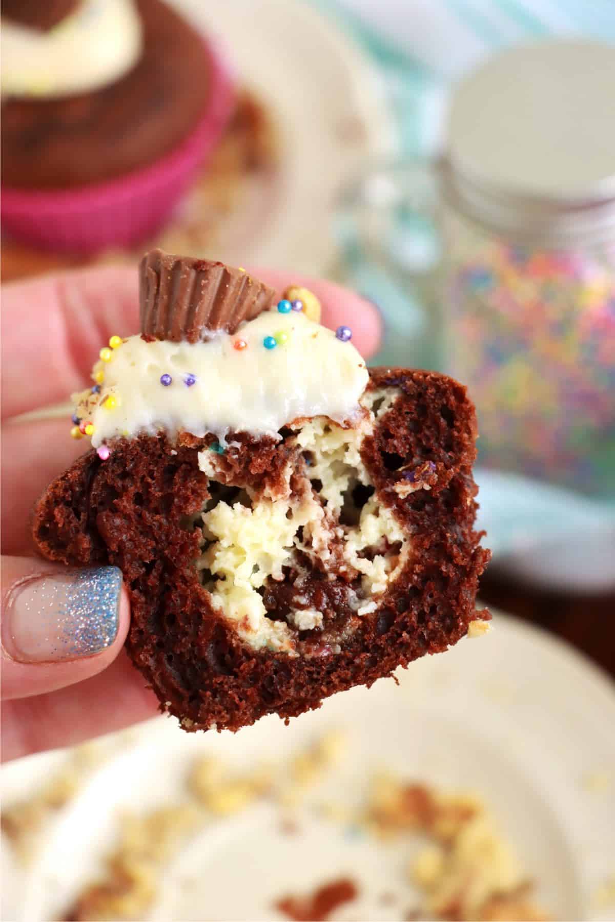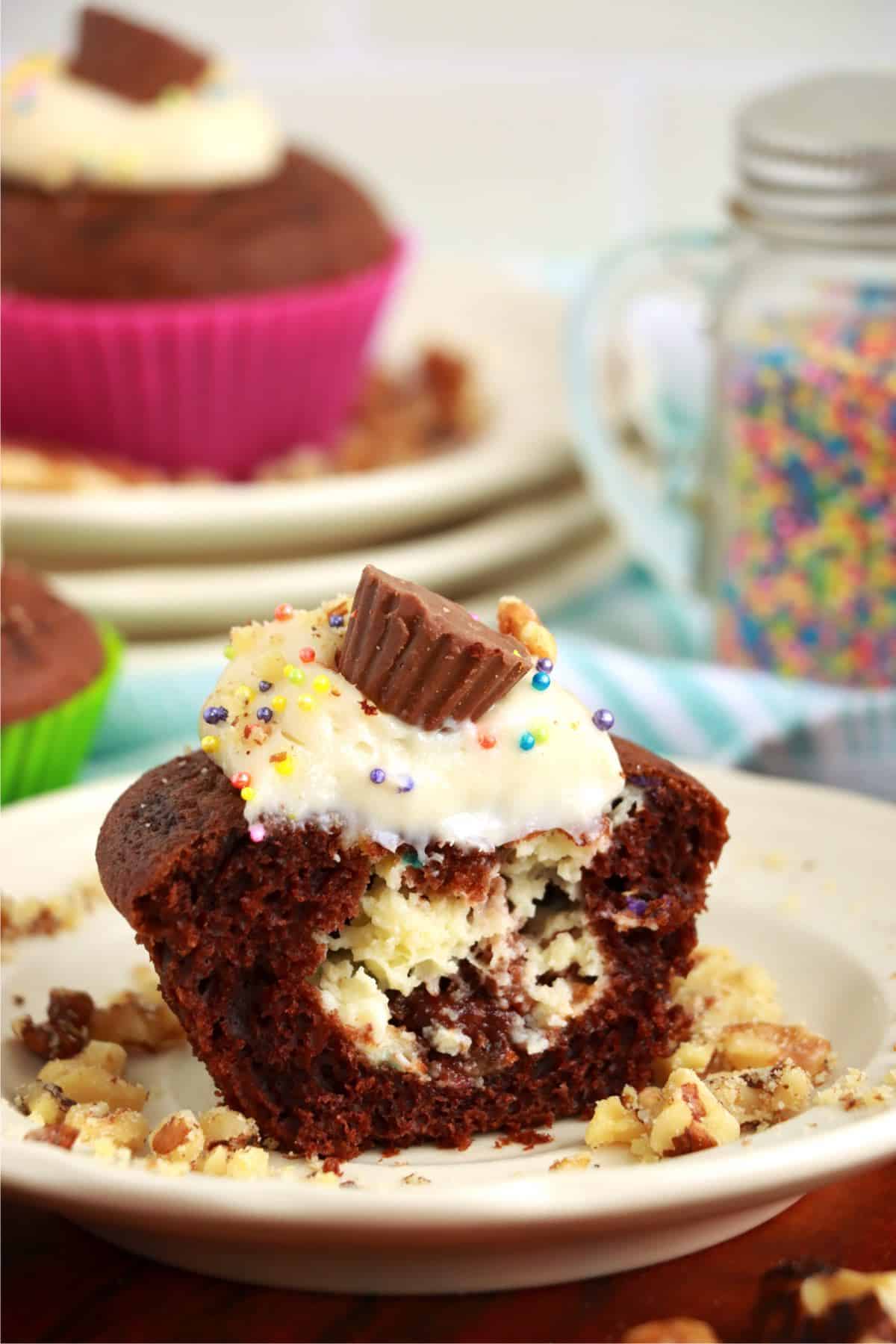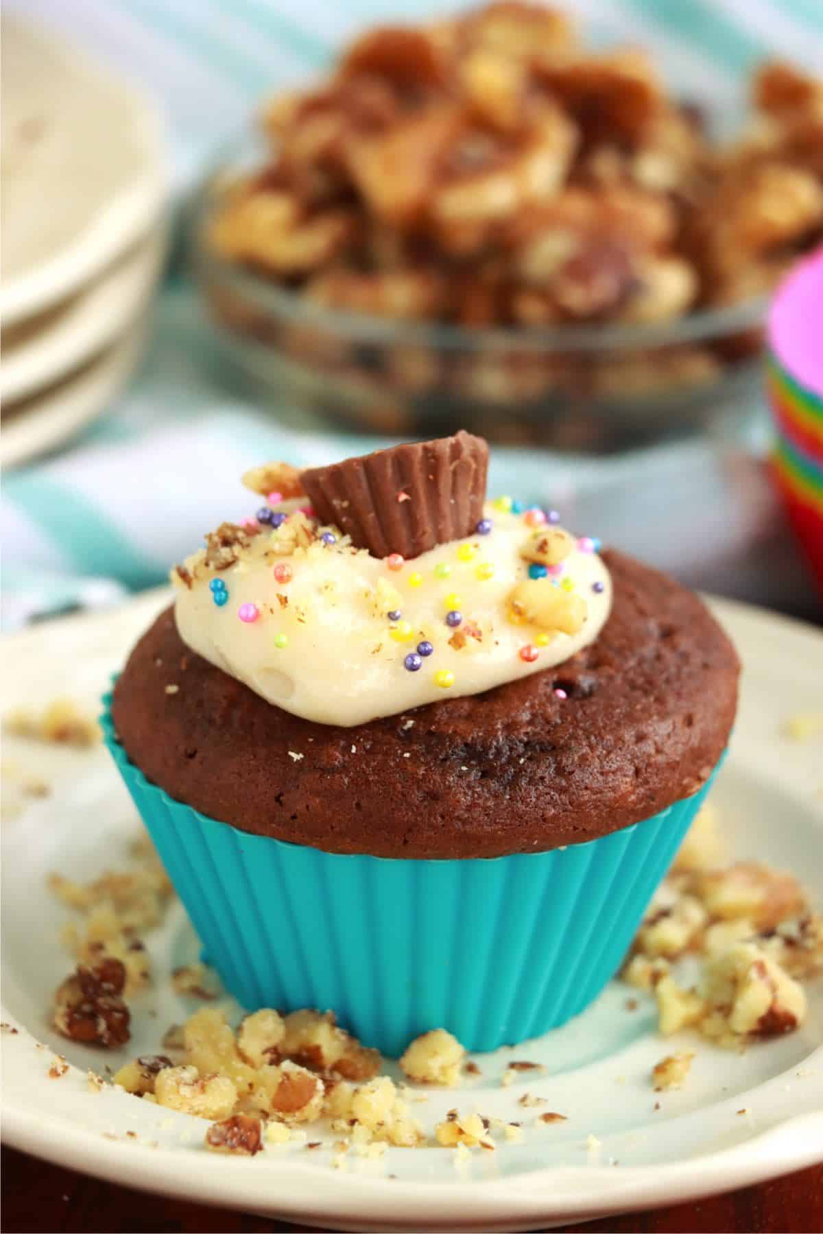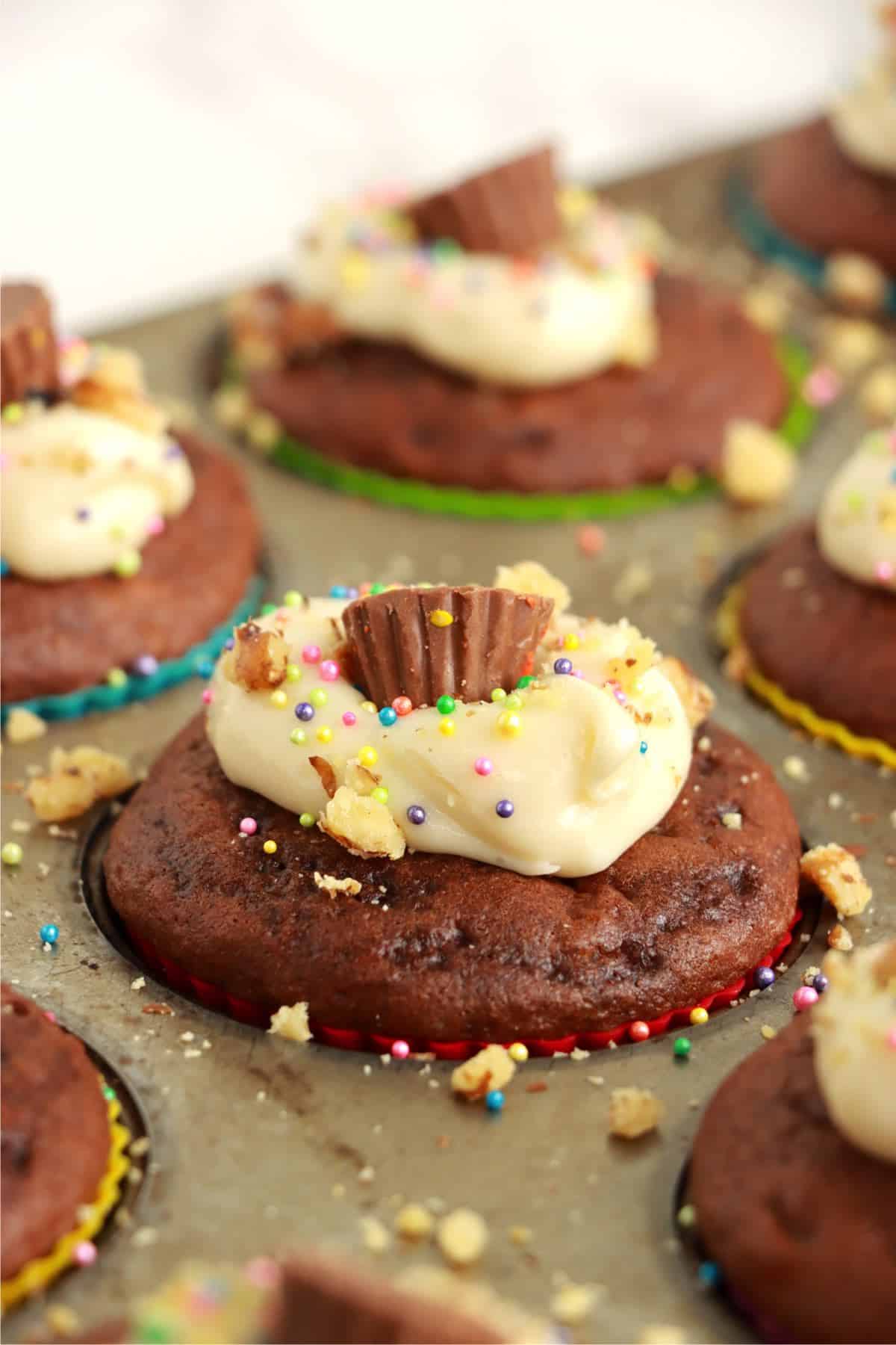 - Ice cupcakes and top with a mini peanut butter cup and sprinkles.