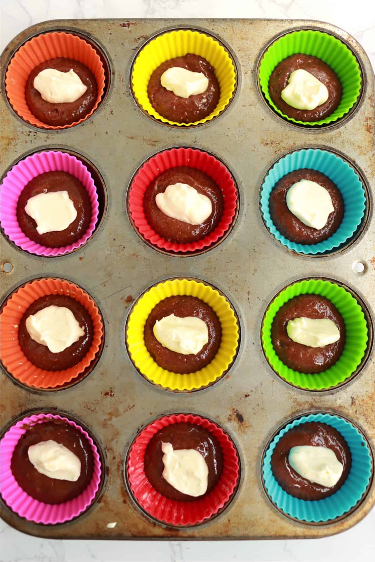- Add one spoonful of cream cheese filling to the center of each baking cup on top of the batter.