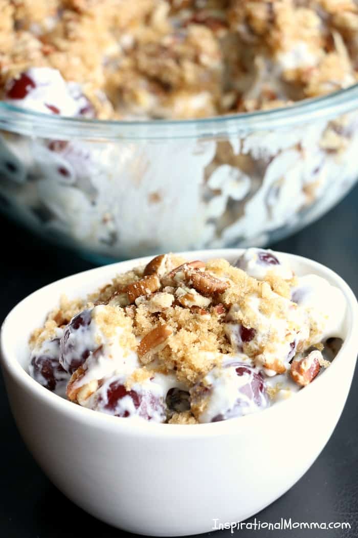 - For topping, combine brown sugar and pecans. Sprinkle over grapes, covering completely.