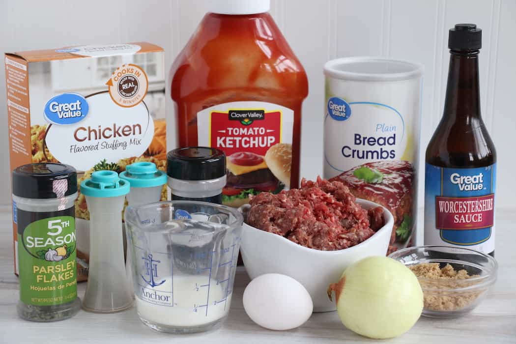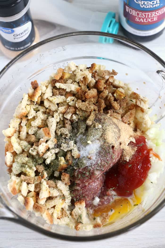 - Combine ground beef, breadcrumbs, onions, stuffing mix, milk, egg, 1/4 cup ketchup, Worcestershire sauce, salt, pepper, parsley flakes, and garlic powder. Combine them thoroughly. I do this with my hands.
