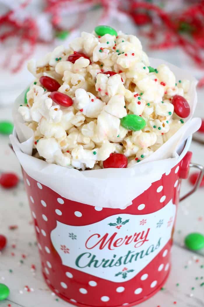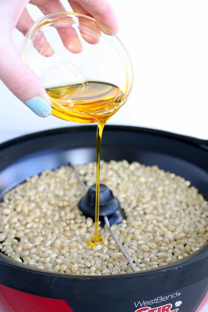 This recipe calls for 12 cups of popped popcorn.  When I am in a rush, I have no problem grabbing a bag of plain popcorn off the store shelf.  However, my kids are infatuated with our popcorn popper, so that is usually what I use.  Because all poppers are different, refer to your instruction manual for ingredients and amounts.