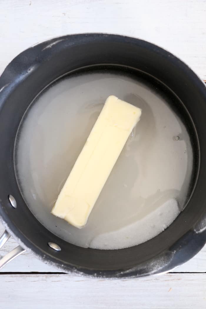 Next, we need to prepare that sticky, ooey-gooey, delicious sauce!  Combine the corn syrup, butter, and sugar in a medium saucepan over medium heat, and stir often, bringing the mixture to a boil for two minutes.