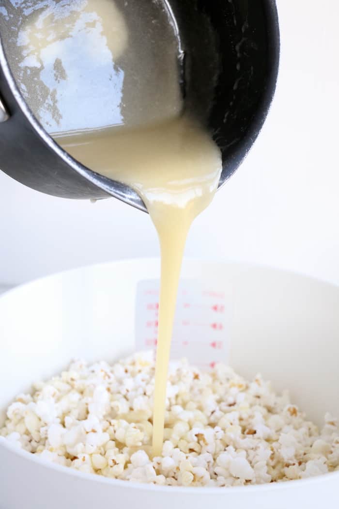 4. Pour mixture over top of popcorn, stirring to coat evenly.