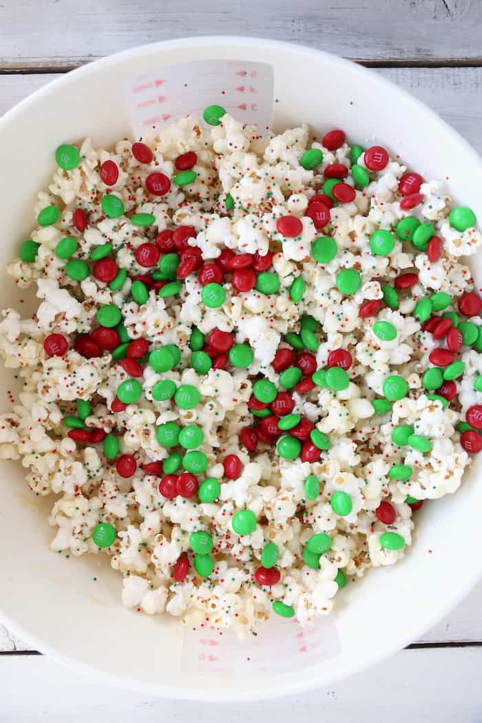 Next, add the M&Ms and sprinkles and stir again.  This is where I struggle with self-control.  It is just so tempting, and I can't help myself.  While I allow the popcorn to cool for 15 minutes, a large portion always seems to disappear! 🤔