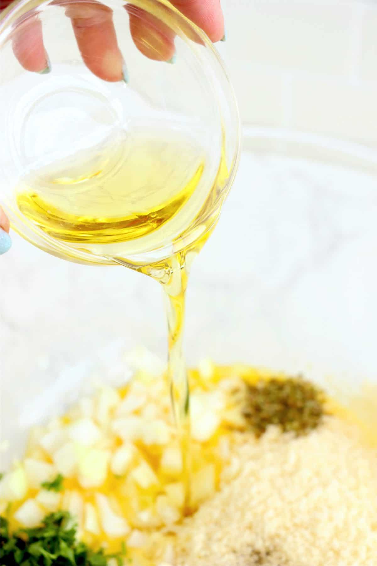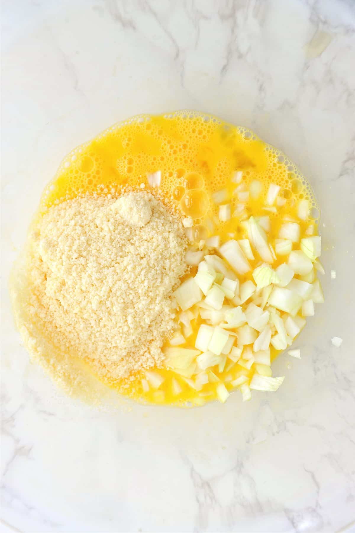- Add onions, ½ cup Parmesan cheese, oil, parsley, salt, pepper, oregano, and garlic powder. Stir well.