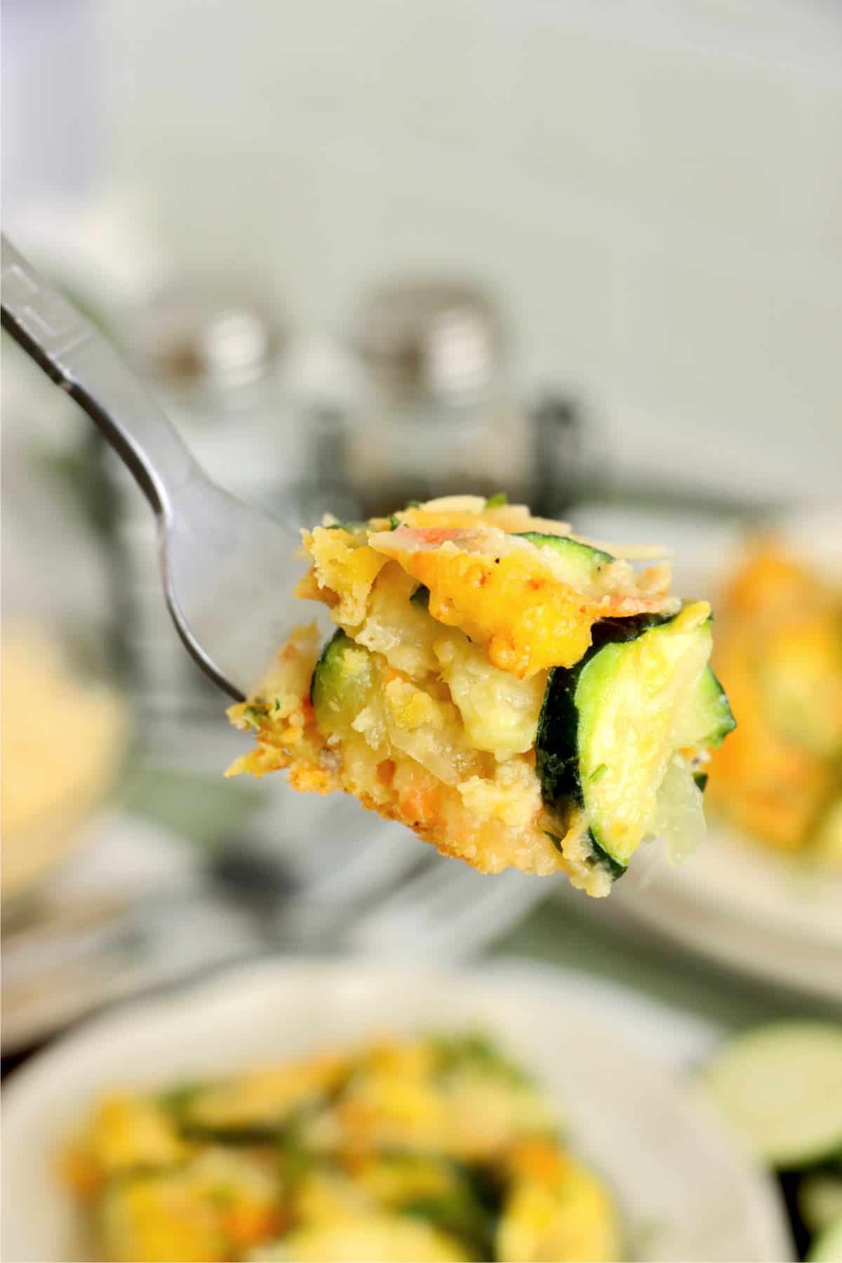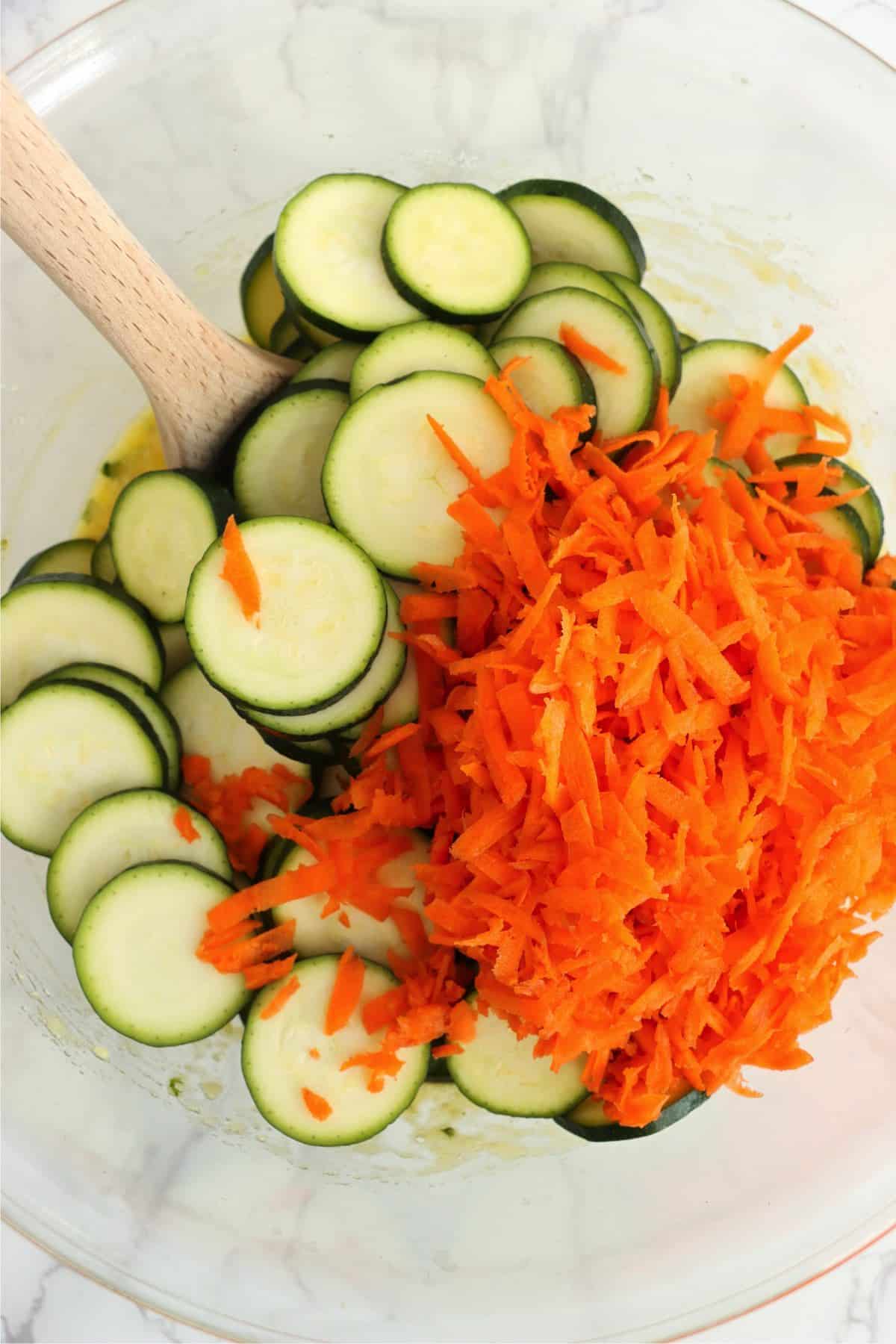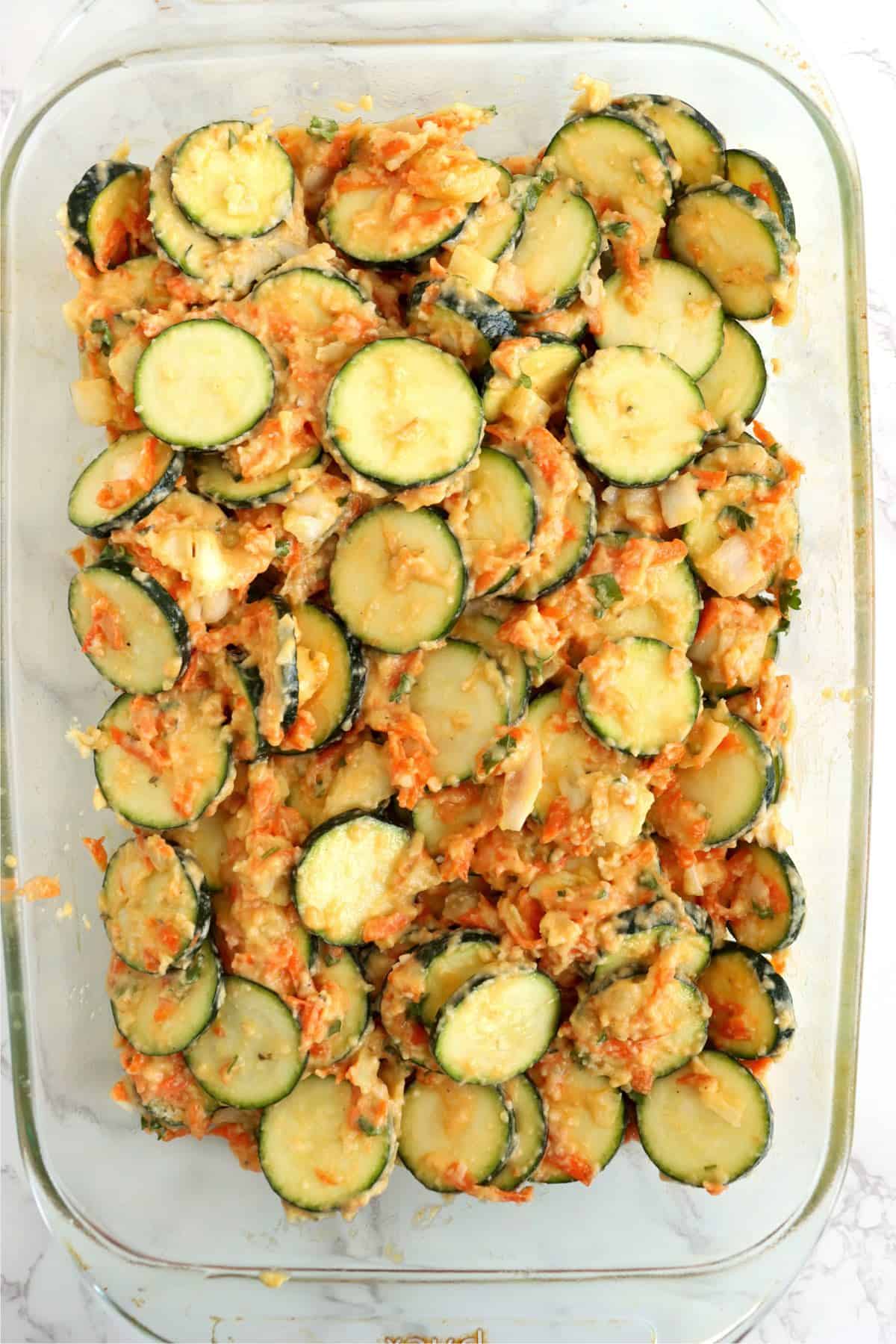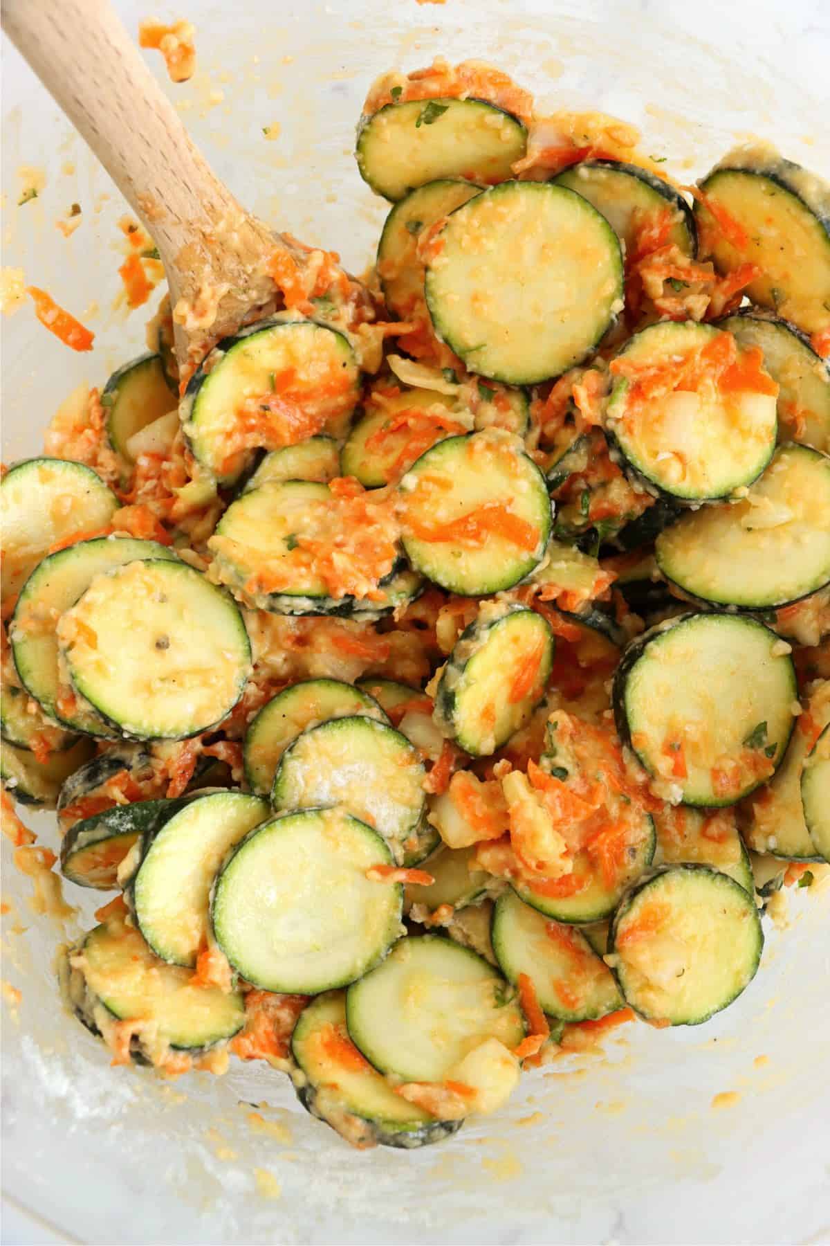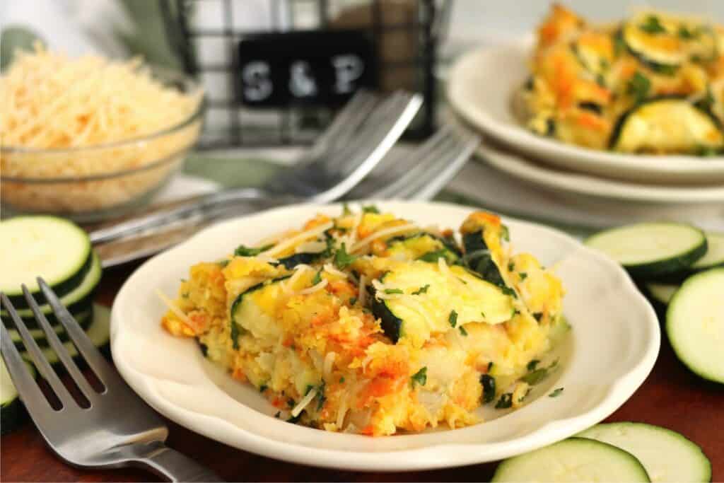 This zucchini carrot casserole features thin-sliced zucchini, shredded carrots, onions, cheese, and biscuit mix. It's an easy, rustic casserole that makes the perfect side and always satisfies everyone.