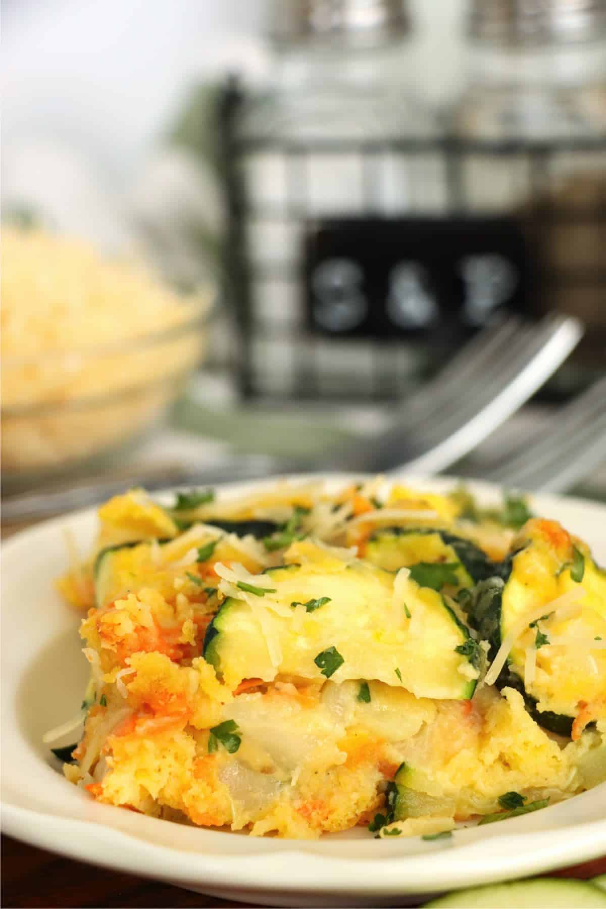 This zucchini carrot casserole is full of veggies, cheese, and a hearty biscuit mix. It's also super easy to make!