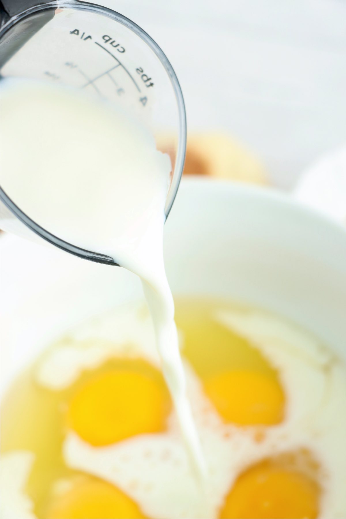- In a small mixing bowl, beat eggs, milk, sugar, and cinnamon together.