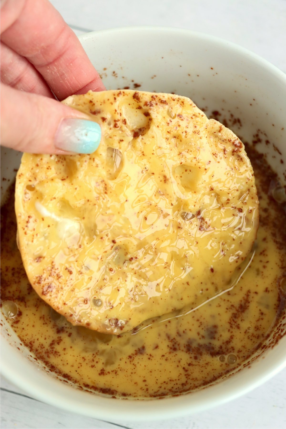 - Dredge each half of the English muffins in the egg mixture, allowing it to soak for about 5 seconds.