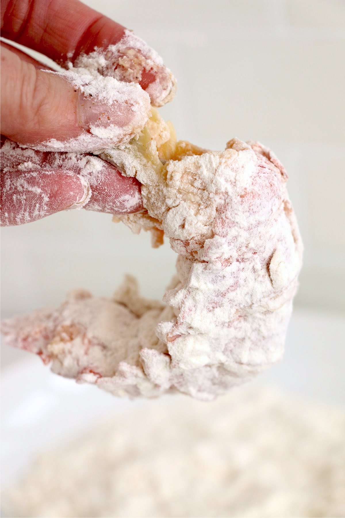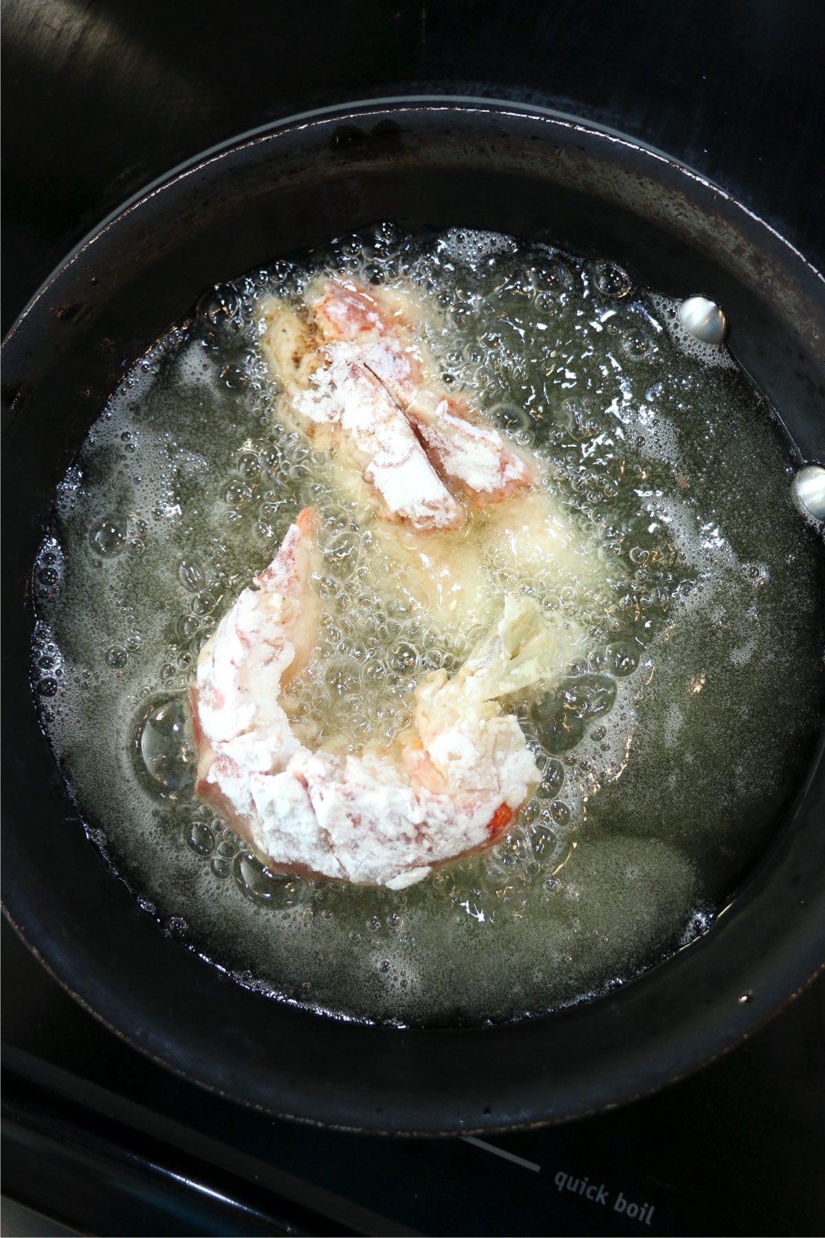 - Dredge each lobster tail in milk before rolling it in the flour mixture.