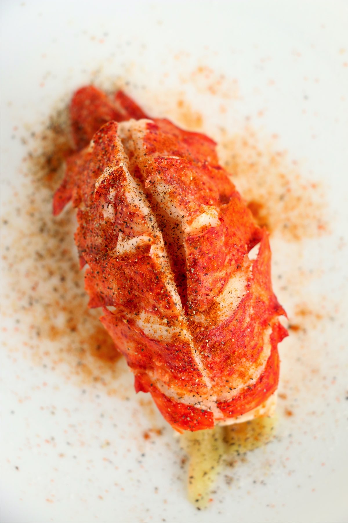 - Season both lobster tails with salt, pepper, and paprika. Allow to sit for 3 minutes.