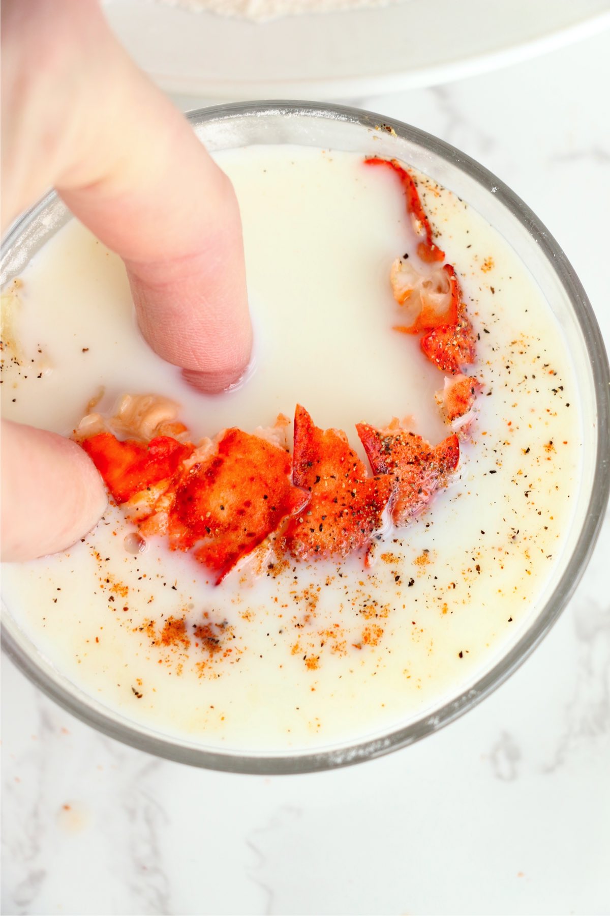 Step 8: Dredge each lobster tail in milk before rolling it in the flour mixture.