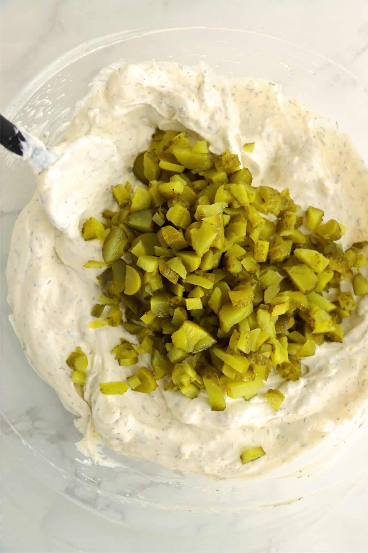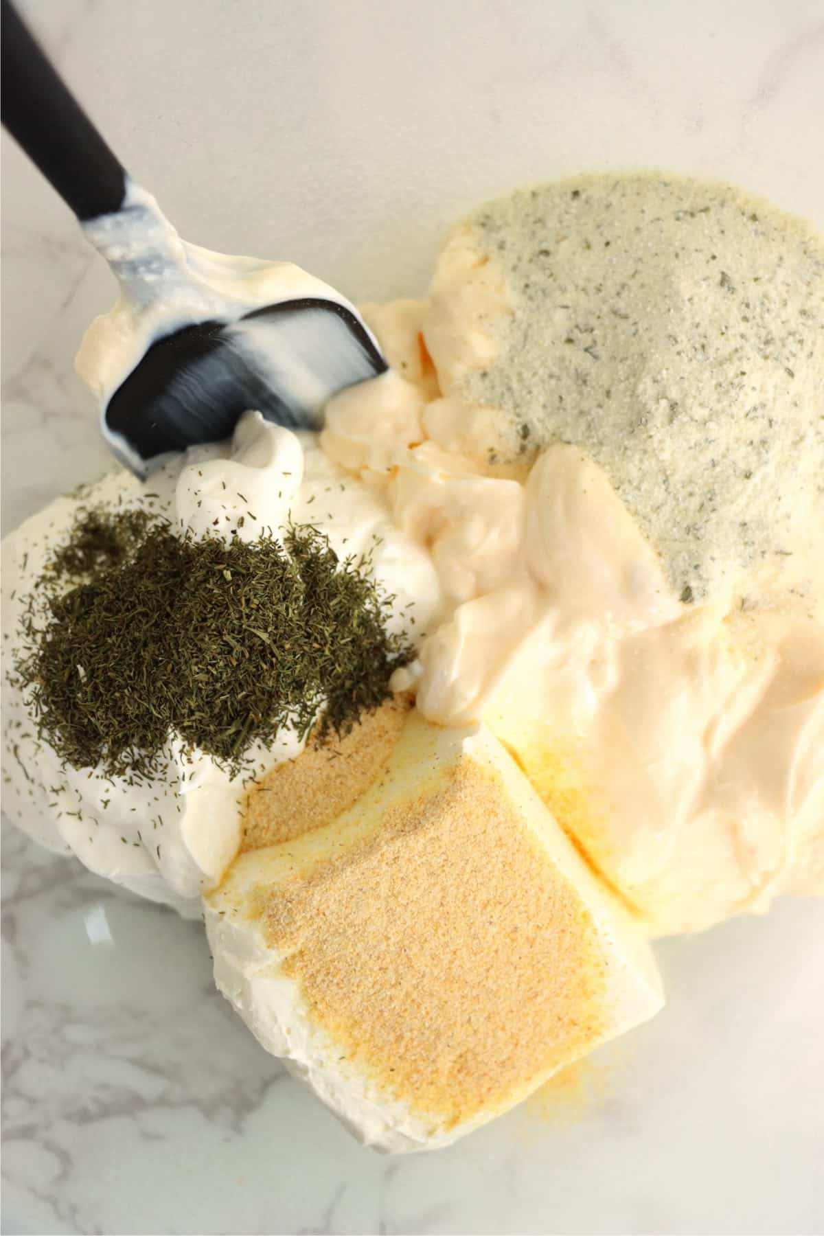 - Combine mayonnaise, sour cream, cream cheese, ranch powder, garlic powder, and dill seasoning in a large mixing bowl. Mix well until everything is combined.