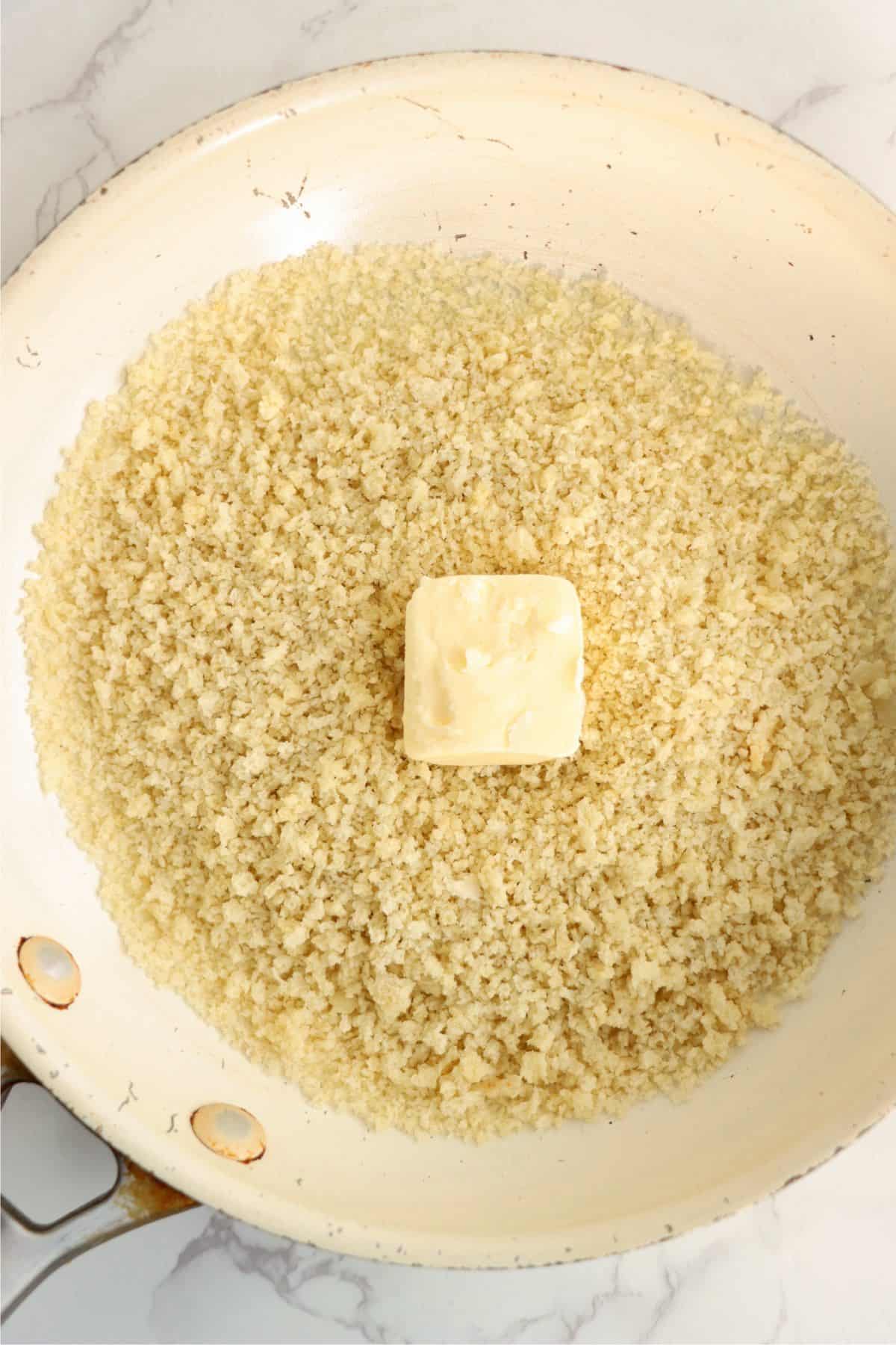 - Prepare panko crumbs by combining them with the butter in a medium saucepan over medium heat.