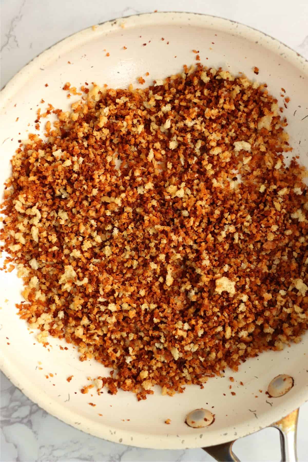 - Stir often to avoid burning. Cook until panko crumbs are golden brown.