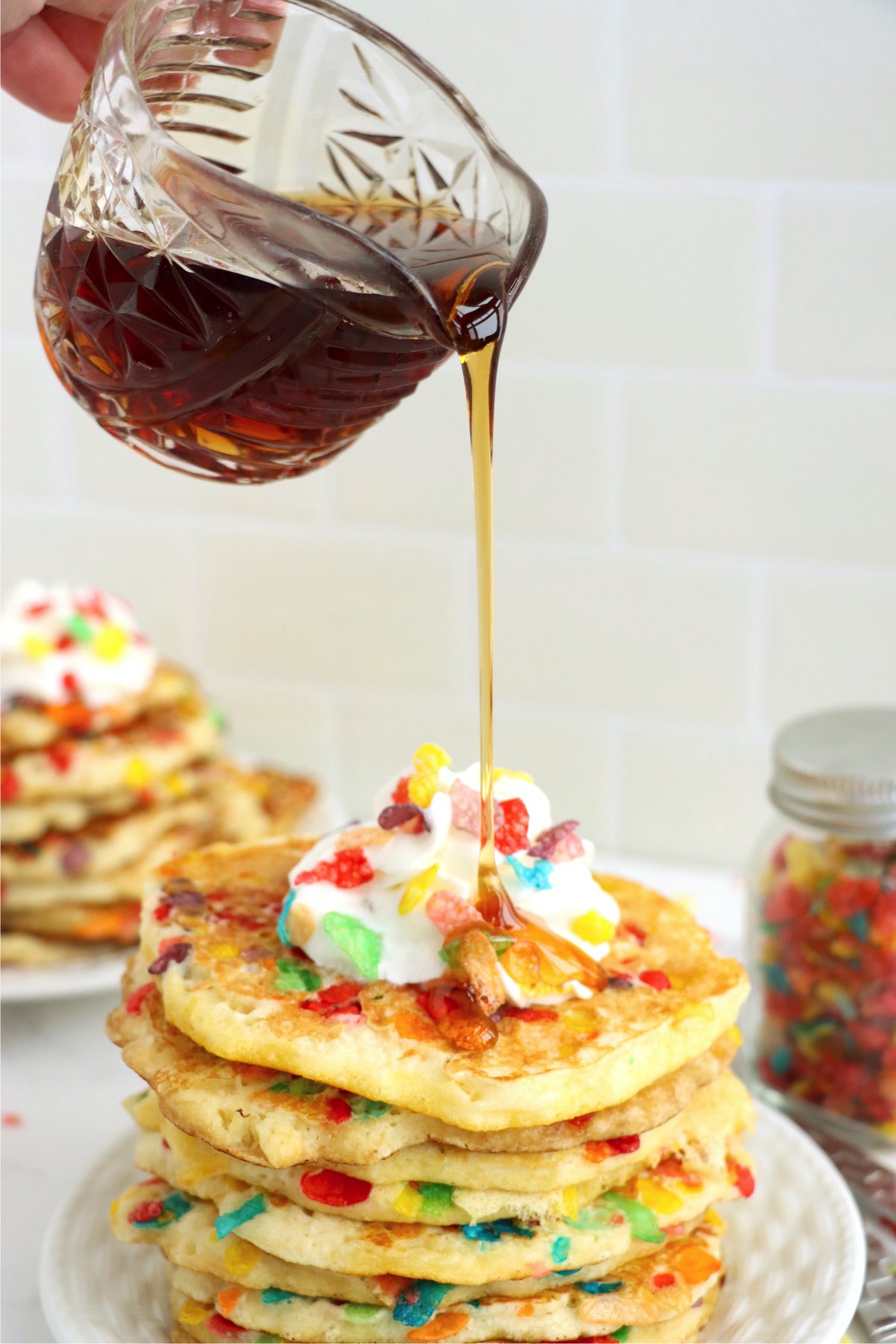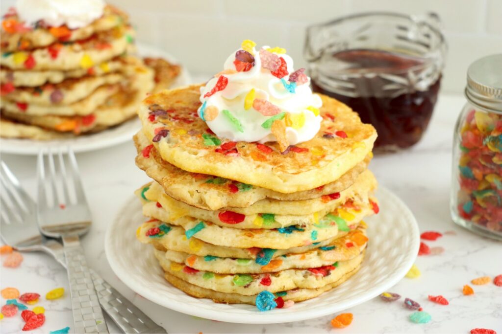 Fruity pebbles pancakes combine one of the most beloved children's cereals ever with light, fluffy pancakes to create a breakfast that's a super sweet way to start the day.