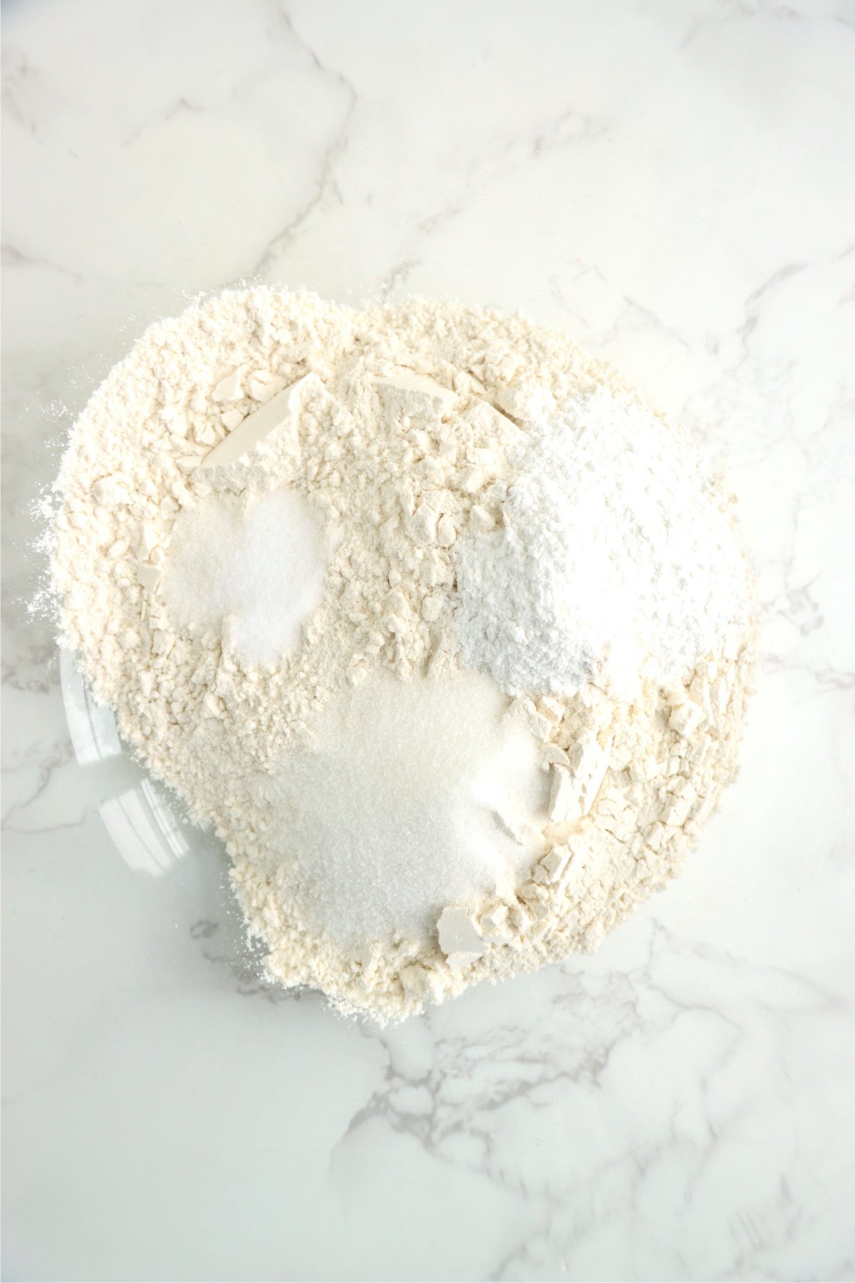 - Add flour, baking powder, sugar, and salt to a large mixing bowl. Whisk together.
