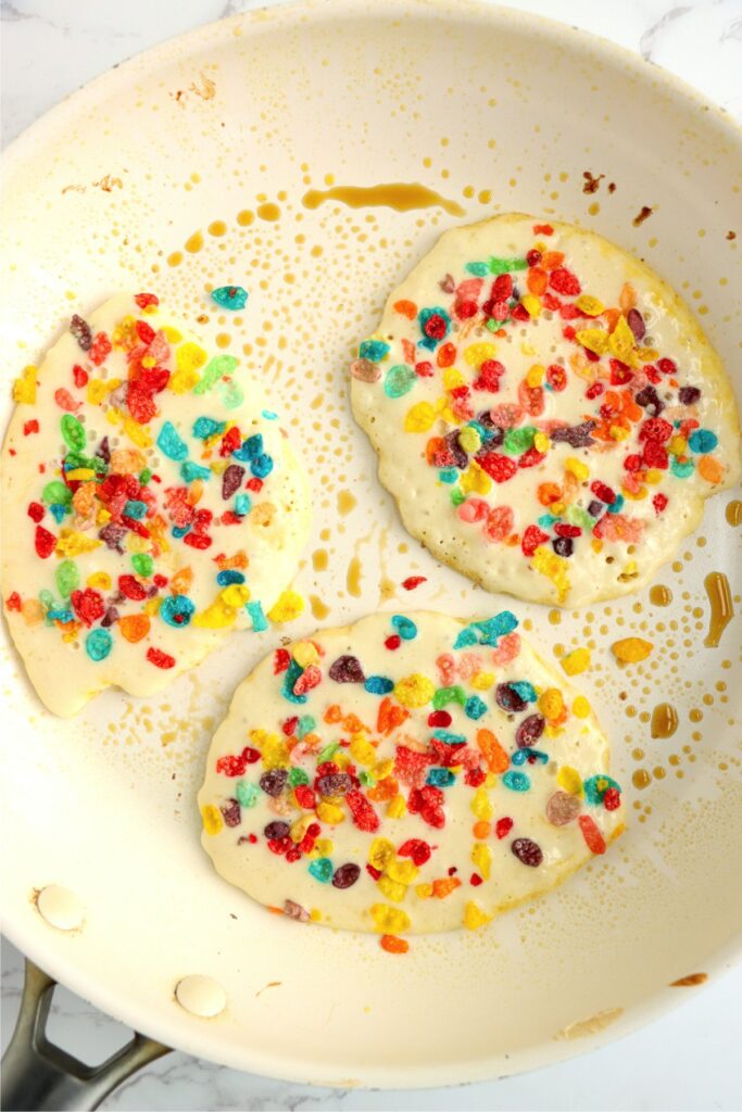 - Sprinkle Fruity Pebbles onto each cooking pancake.