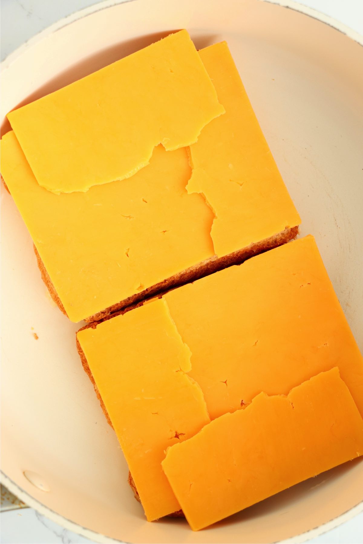 - Place slices of cheese on both pieces of bread, completely covering them.