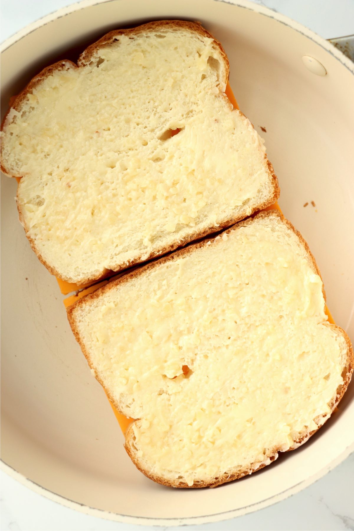 2: Place 2 slices of garlic buttered bread on a skillet and top with cheese, then top with more buttered bread.