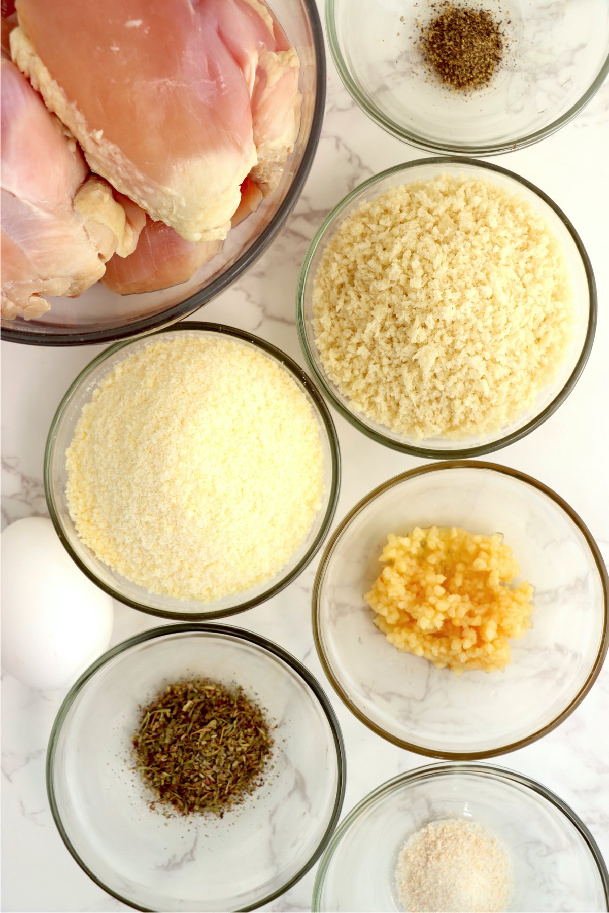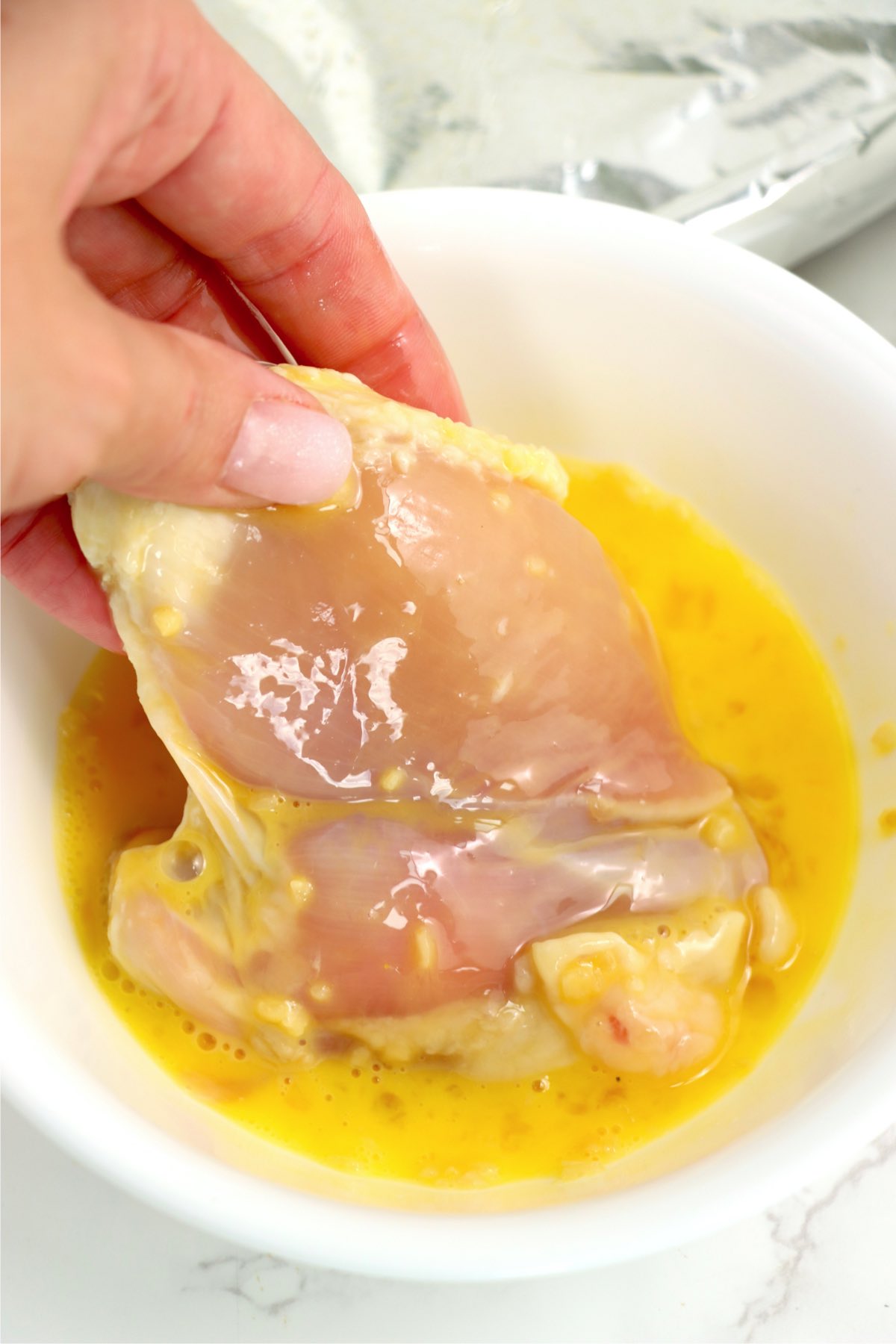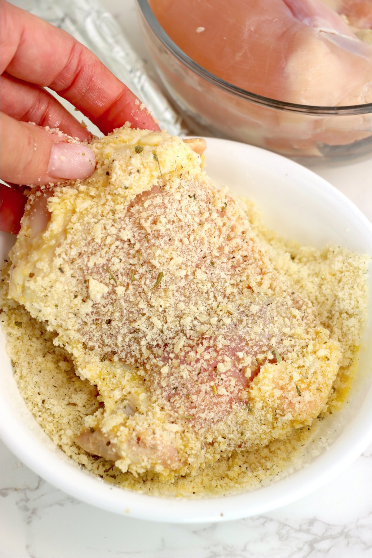 - Dip each chicken thigh into egg mixture, then coat them with the breadcrumb mixture.