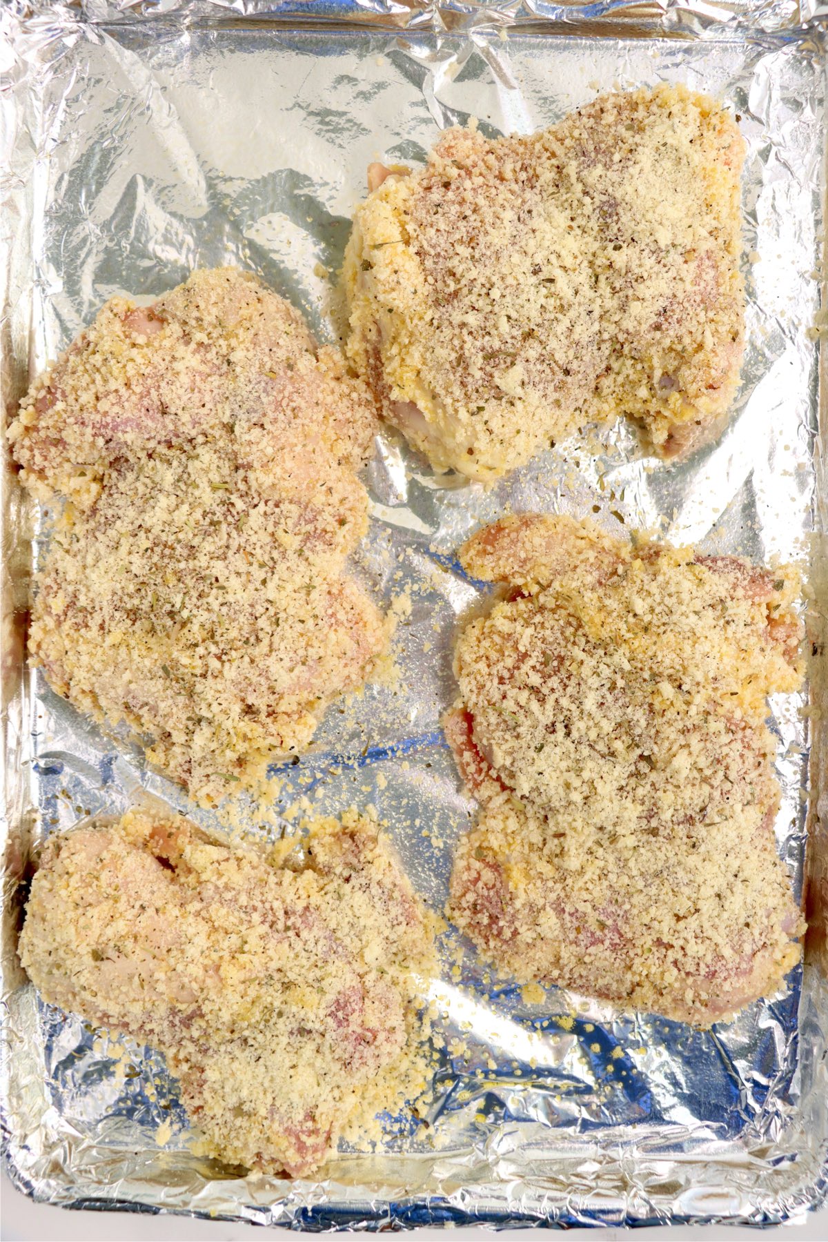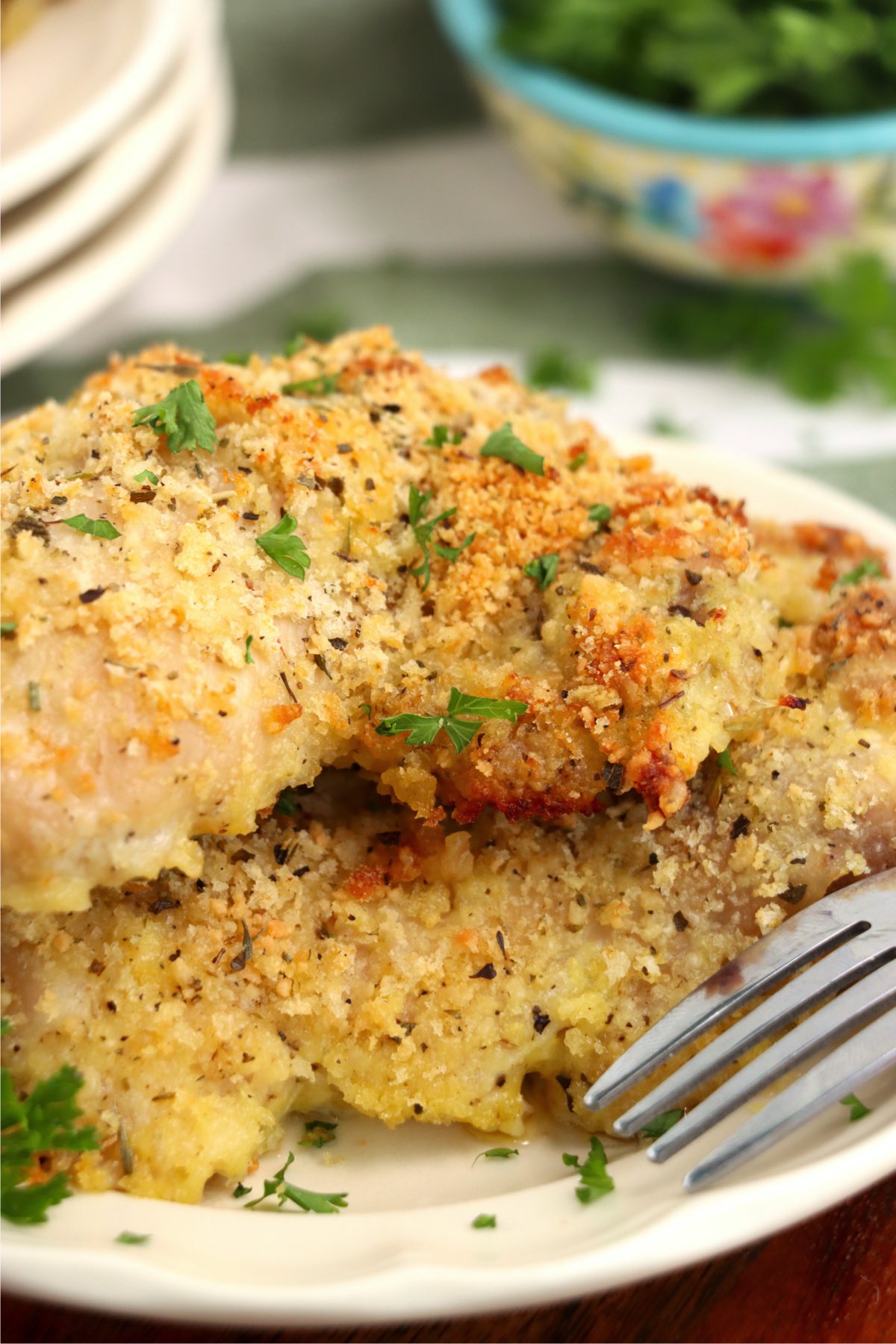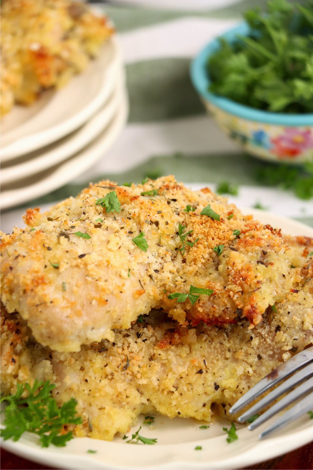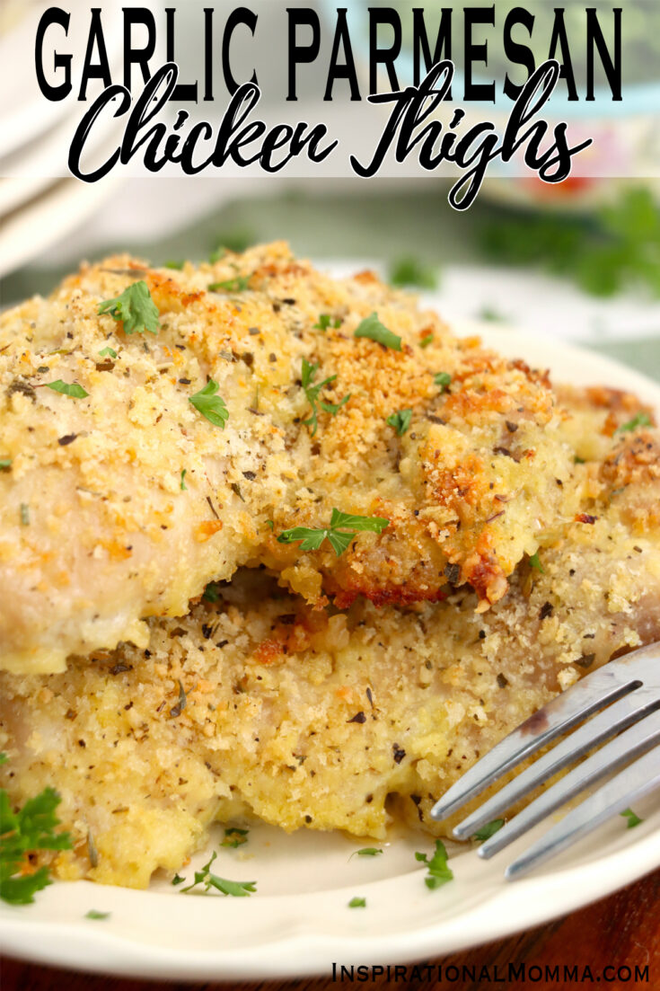 Garlic parmesan chicken thighs are coated in a delicious garlic parmesan breading and then baked to golden brown perfection. Tasty and easy!