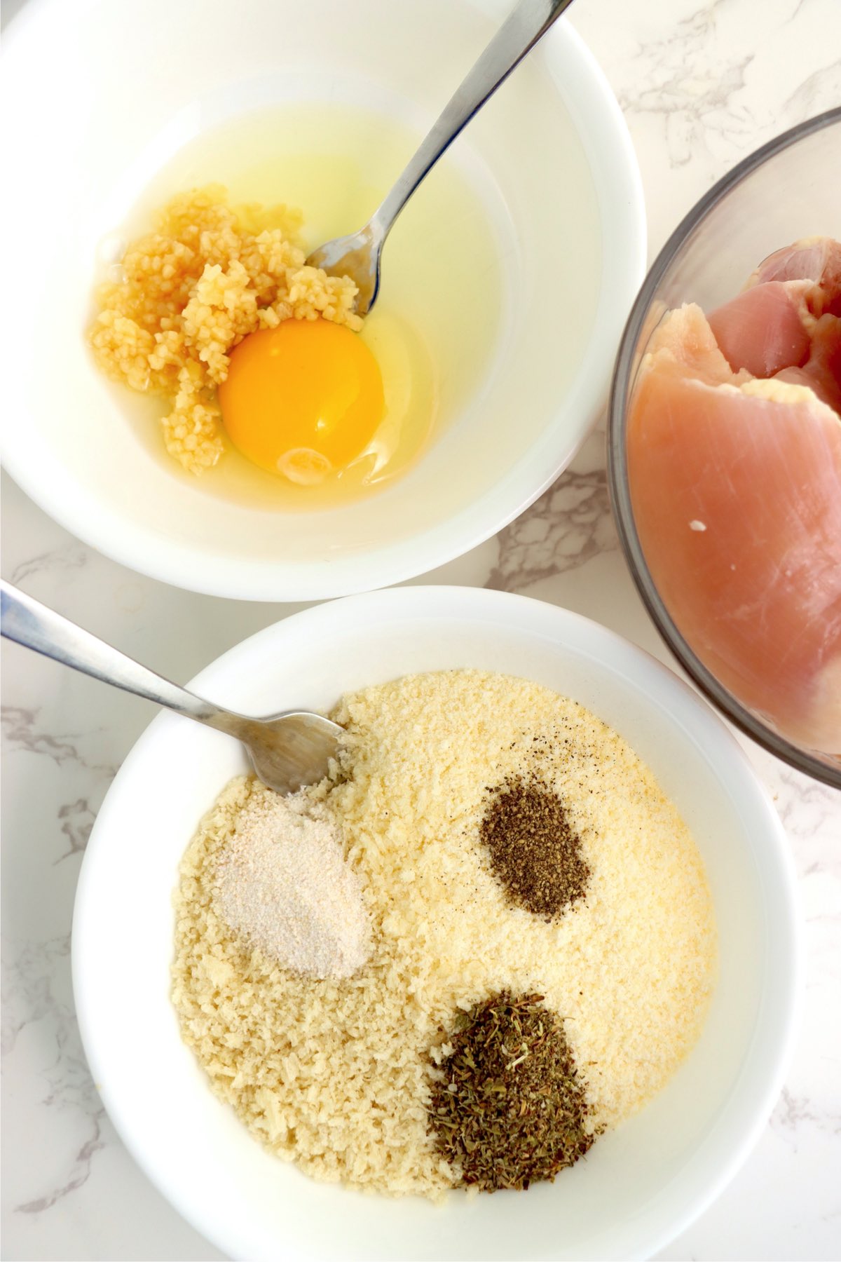 1: Create a dredging station, mixing eggs and garlic in one bowl and the breadcrumbs, parmesan, and spices in another bowl.