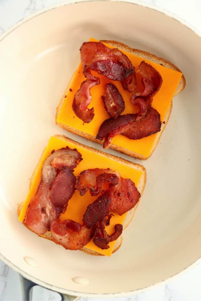 - Butter one side of each slice of bread. Place two pieces of bread, butter side down, in a skillet over low-medium heat. Place a slice of cheese and two slices of bacon on each piece of bread.