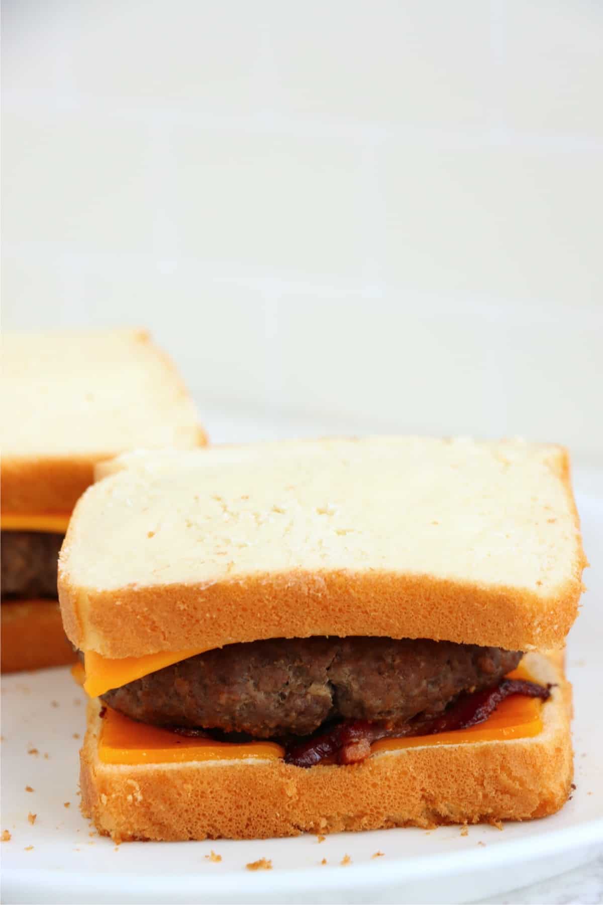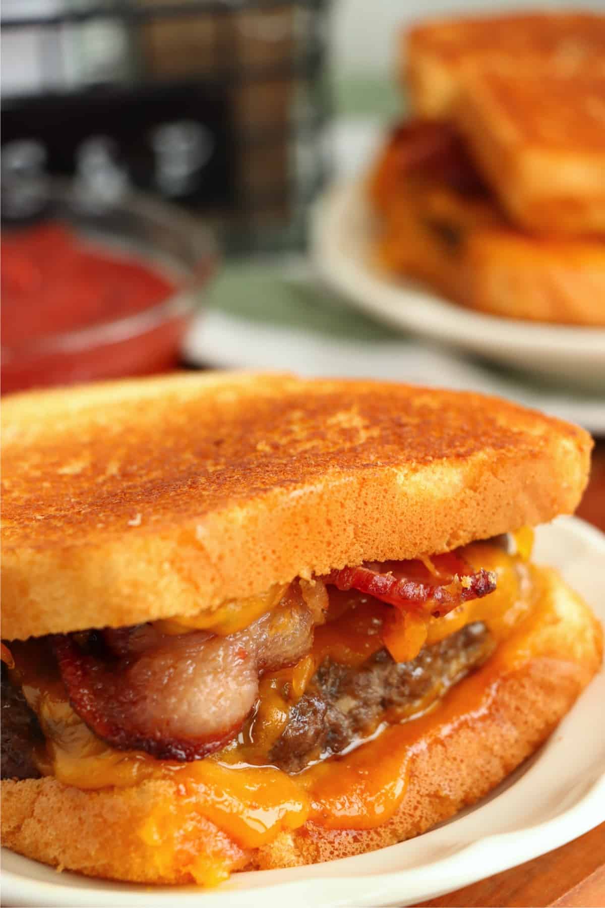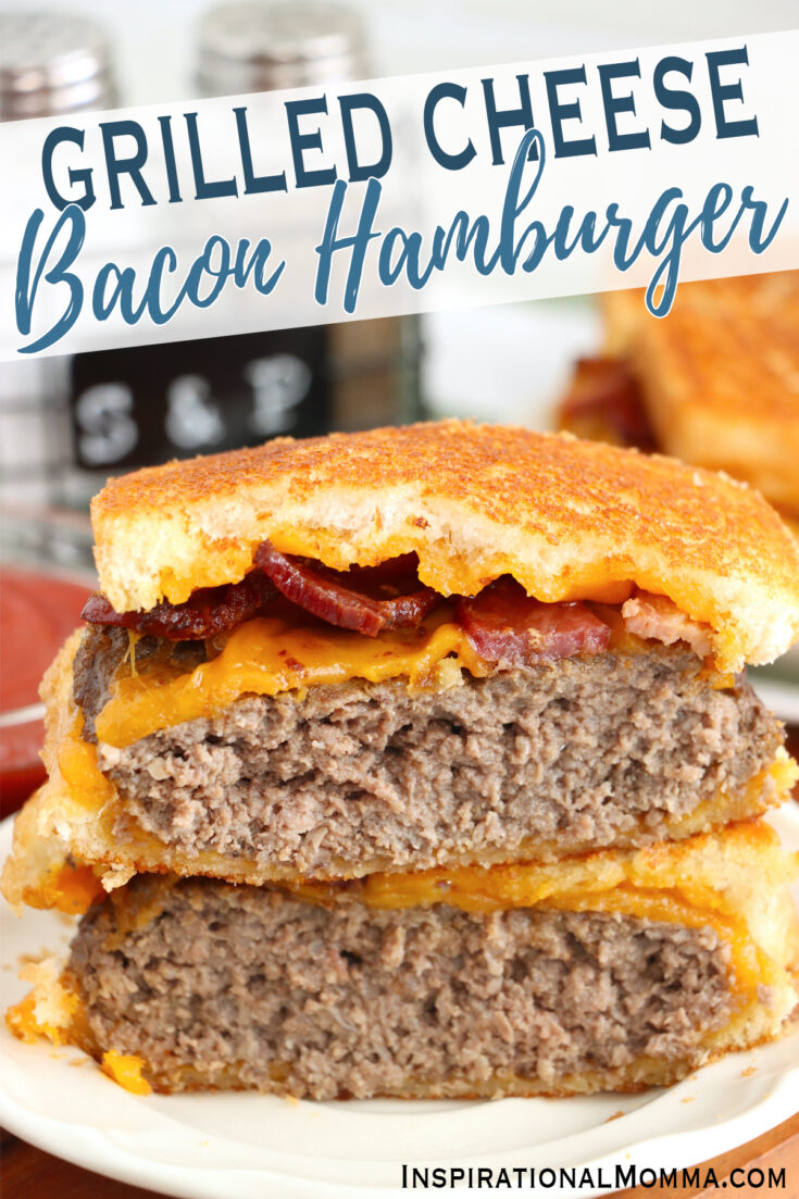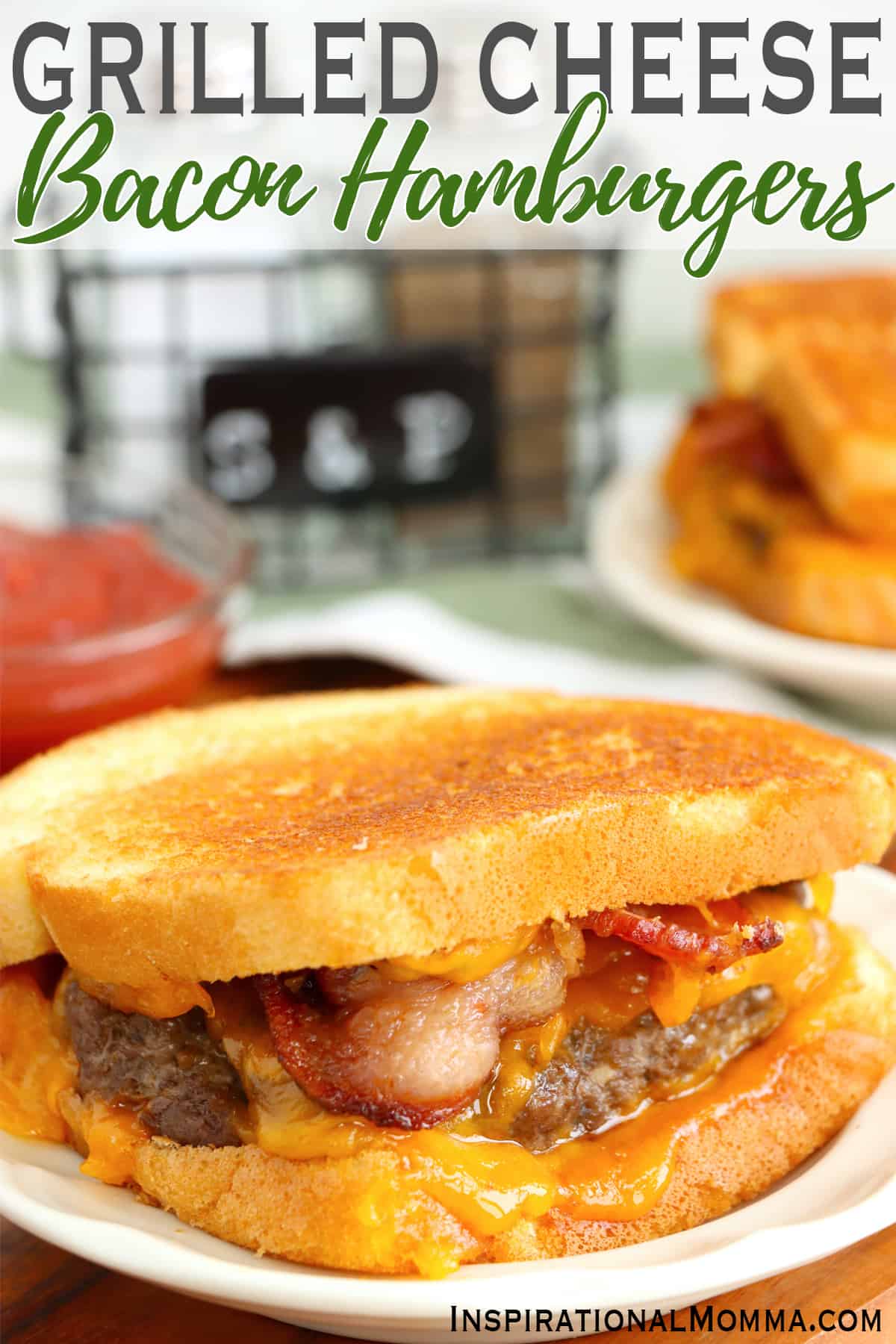 Grilled cheese bacon hamburgers combine bacon burgers and grilled cheese into the ultimate sandwich. It's got it all and then some!