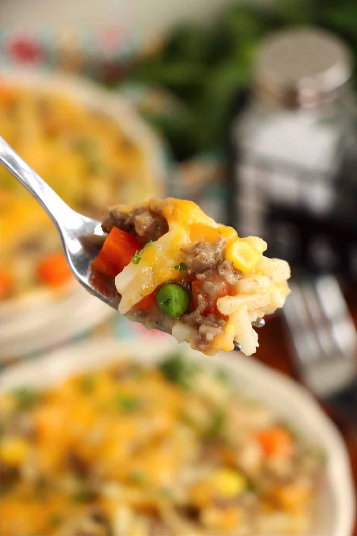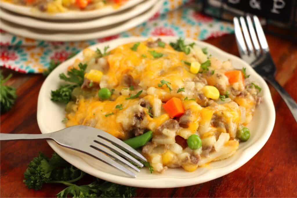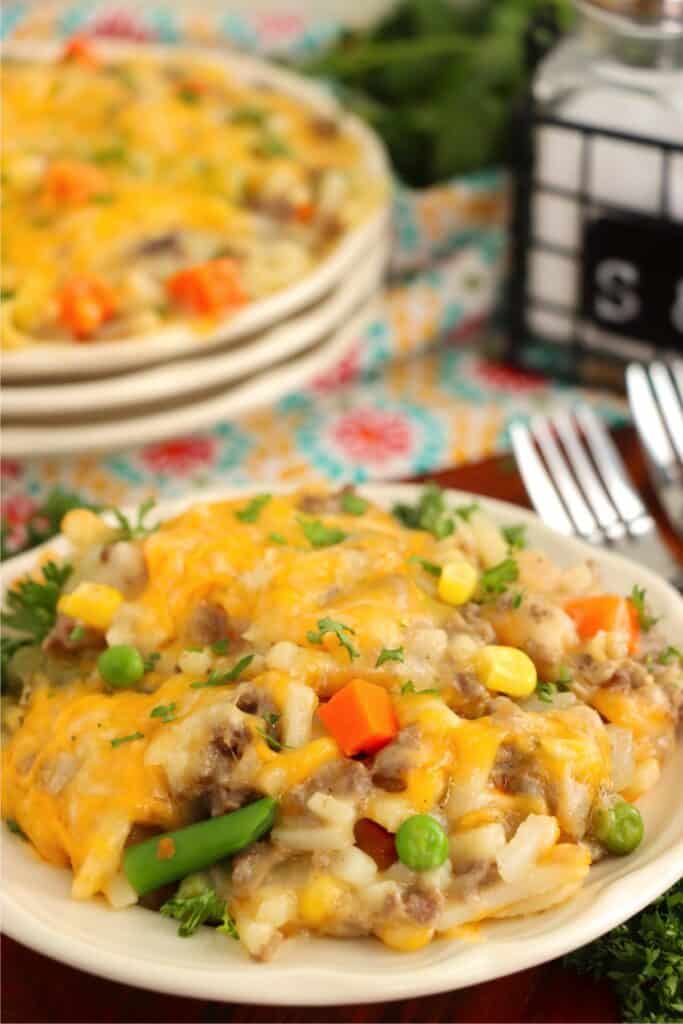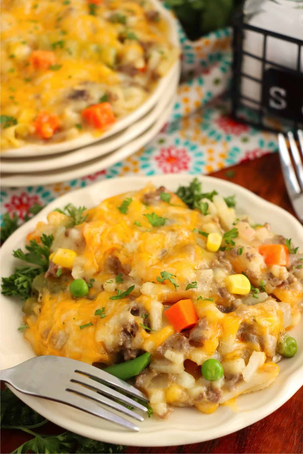This ground beef and hash brown casserole is a hearty, filling dish that fills you up right! Loaded with ground beef, mixed vegetables, cheese, and potatoes, this dish is perfect for feeding your family or bringing to your next potluck.